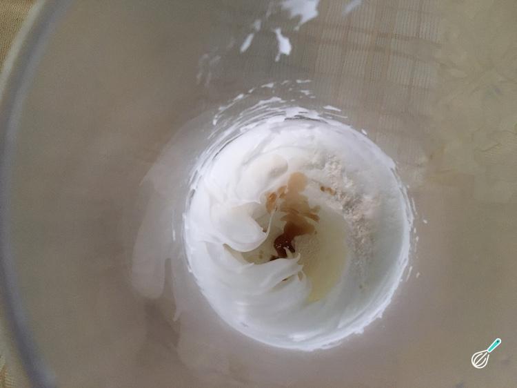 Em seguida junte os restantes ingredientes deste sorvete fit, com exceção dos morangos: o creme de leite, a baunilha e o xylitol e misture delicadamente, para não perder o ar.