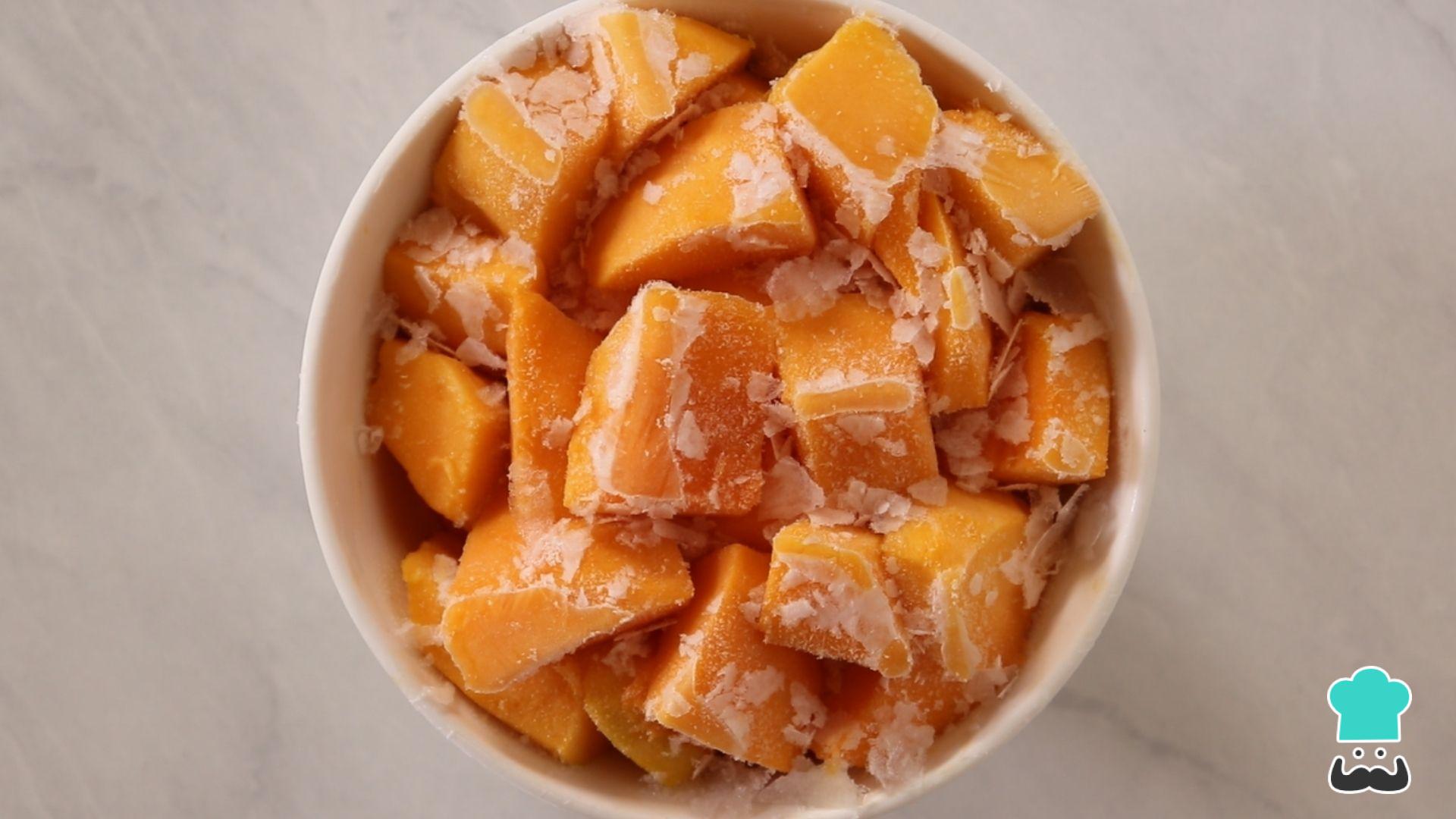 Descasque as duas mangas, corte em cubos e deixe no congelador por, pelo menos, 6 horas.