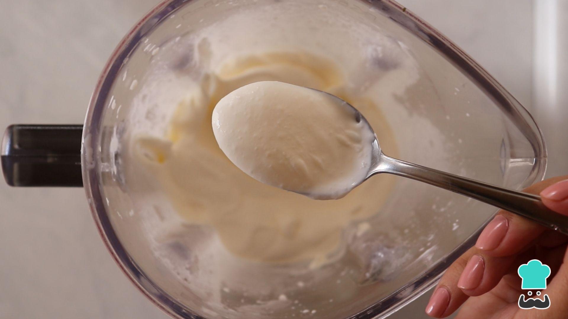 Após esse tempo bata o creme de leite fresco no liquidificador até ficar cremoso como mostra a foto abaixo (é bem rápido, em torno de 3 minutos). Coloque em uma tigela e reserve.