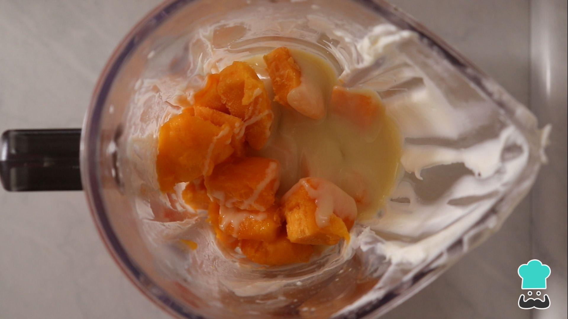 Agora bata a manga cortada em cubos e congelada com o leite condensado no liquidificador.