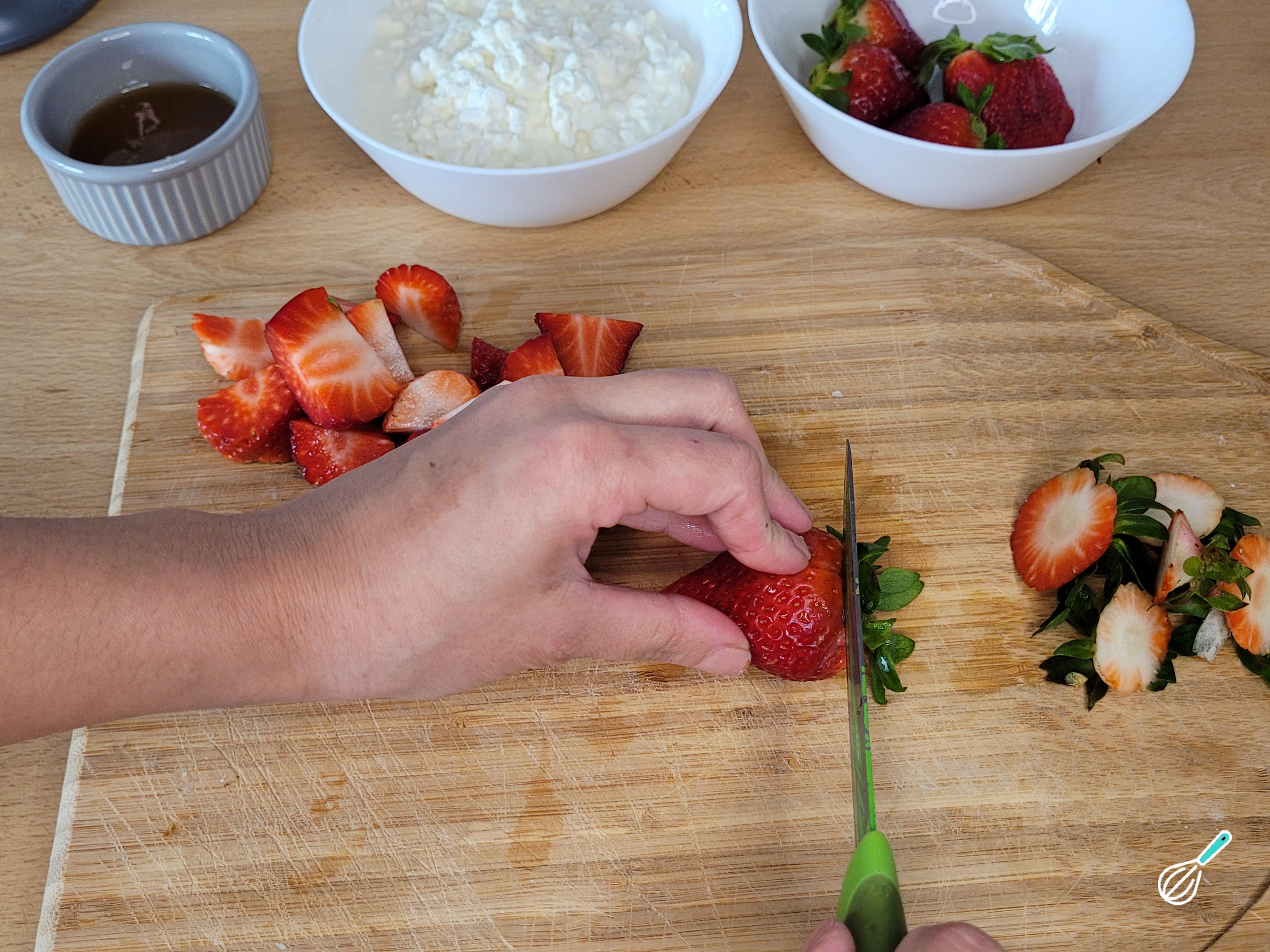 Lave e depois seque bem os morangos, tire as folhas e corte em pedaços.
