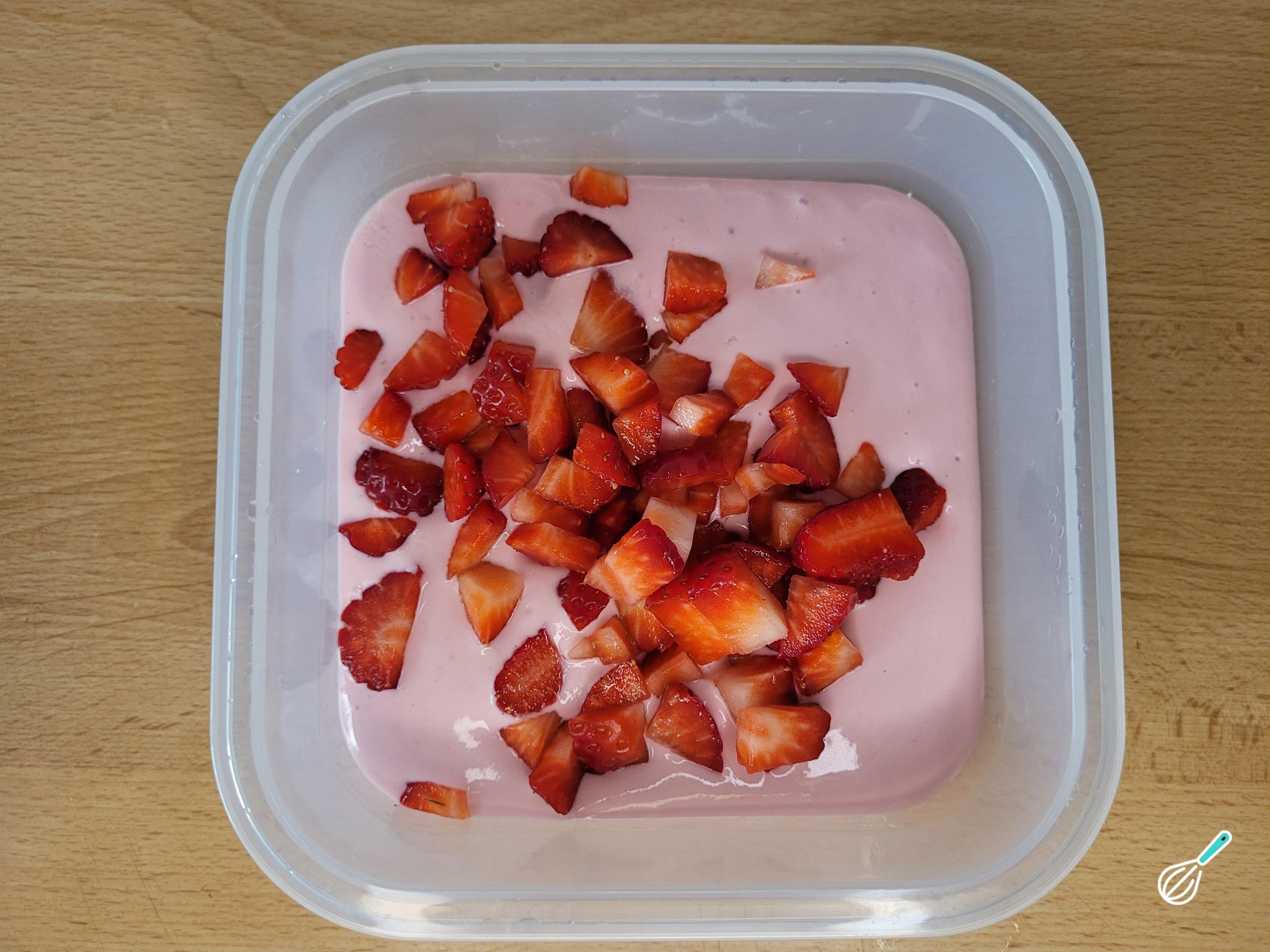 Se quiser, pode misturar alguns morangos picados em pedacinhos pequenos.