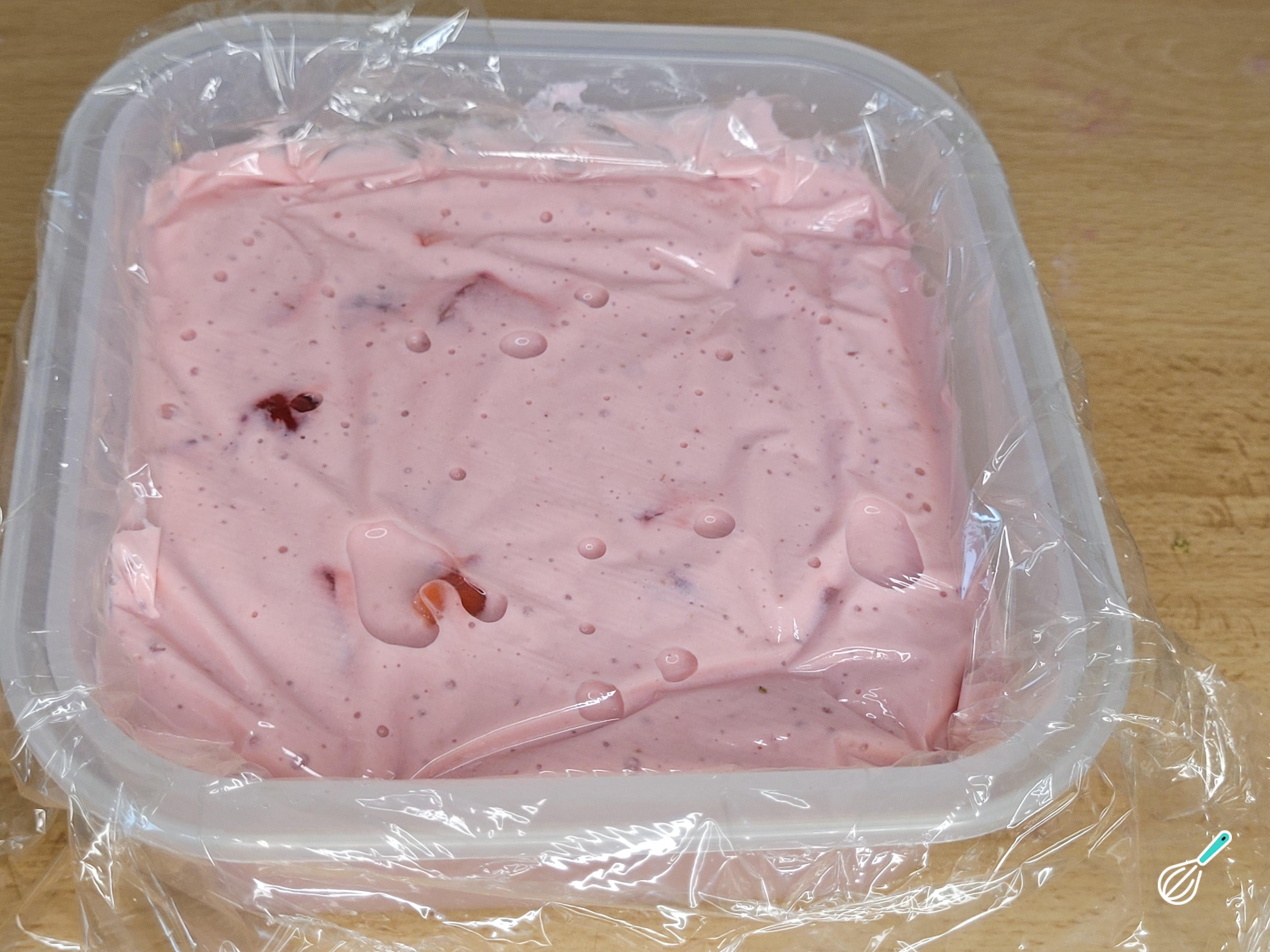Leve o sorvete para o congelador por umas 6-8h até endurecer. Se quiser garantir que o sorvete não irá congelar demais, pode abrir de vez em quando e mexer, sempre lembrando de colocar o plástico filme depois. Depois desse tempo, o sorvete estará pronto para servir!