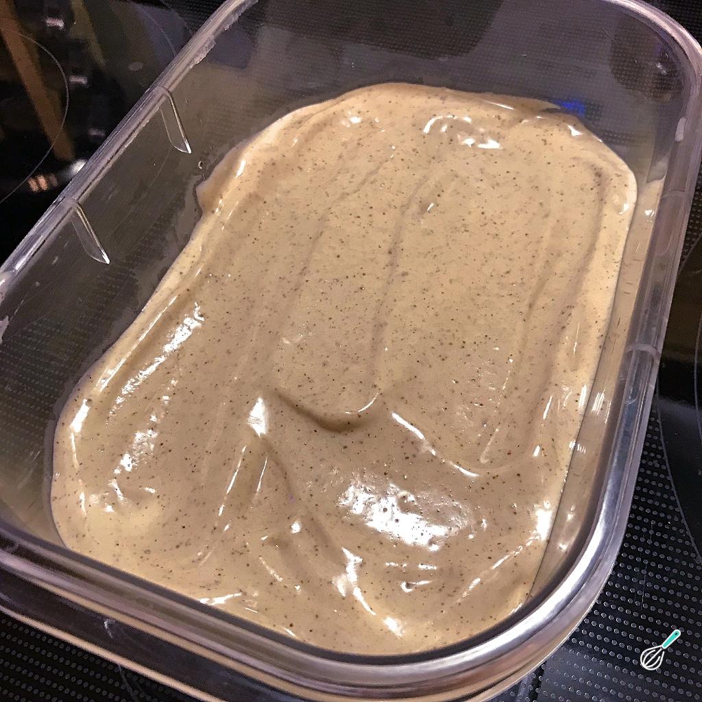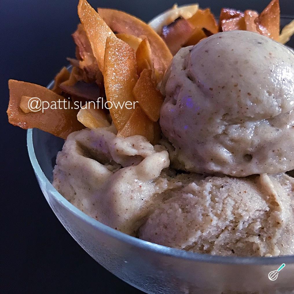 Antes de servir tire o sorvete vegano de banana com manteiga de amêndoas do freezer e deixe descansar por 10 minutos.