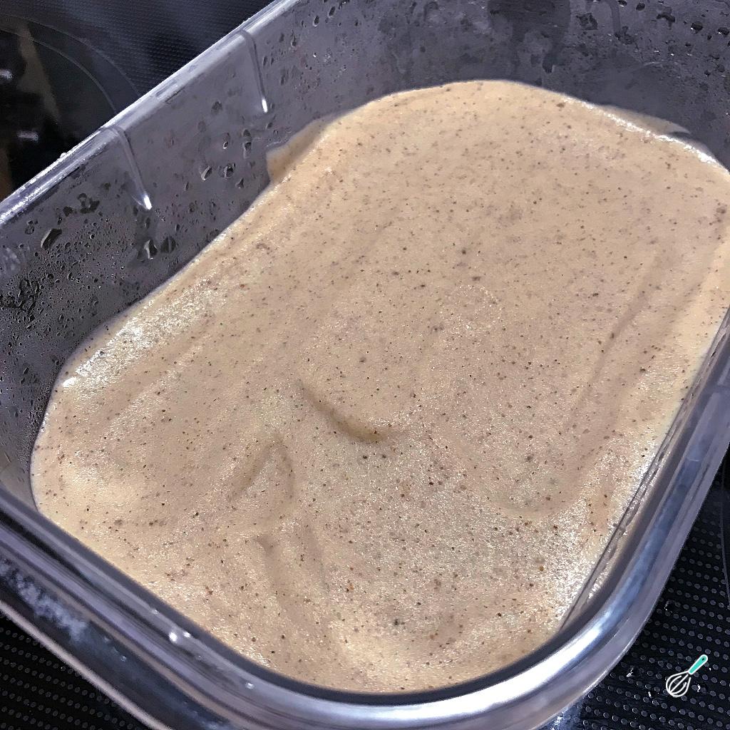 Comece seu sorvete de banana congelada batendo as bananas no liquidificador (ou processador) até virarem um creme suave, como na imagem.
