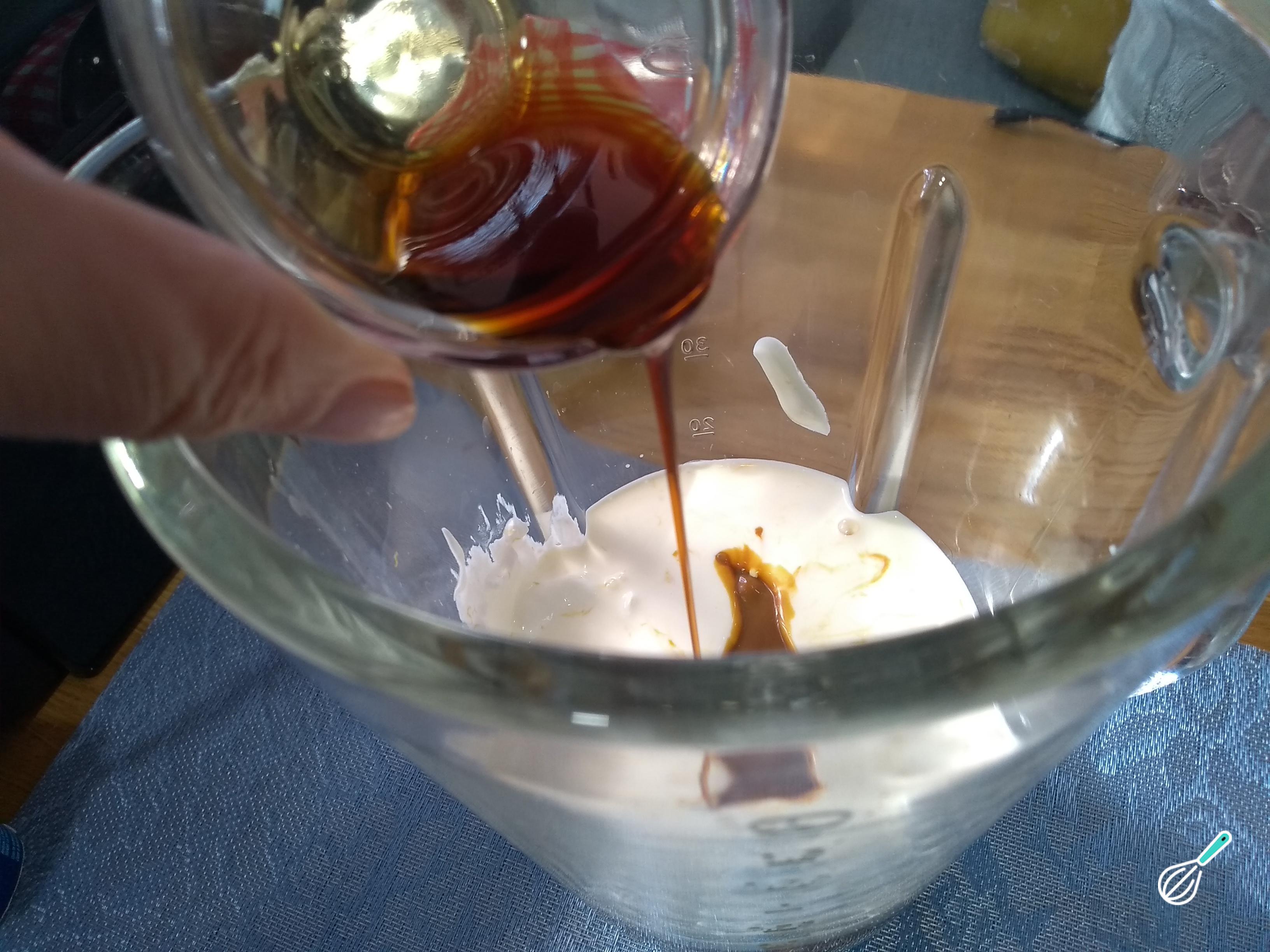 Despeje o creme de leite, os iogurtes e o doce de leite no liquidificador ou num mixer. Se desejar, coloque também a essência de baunilha, pois ela ajuda a conseguir um gostinho extra. Bata até obter uma mistura homogênea e com textura muito cremosa.