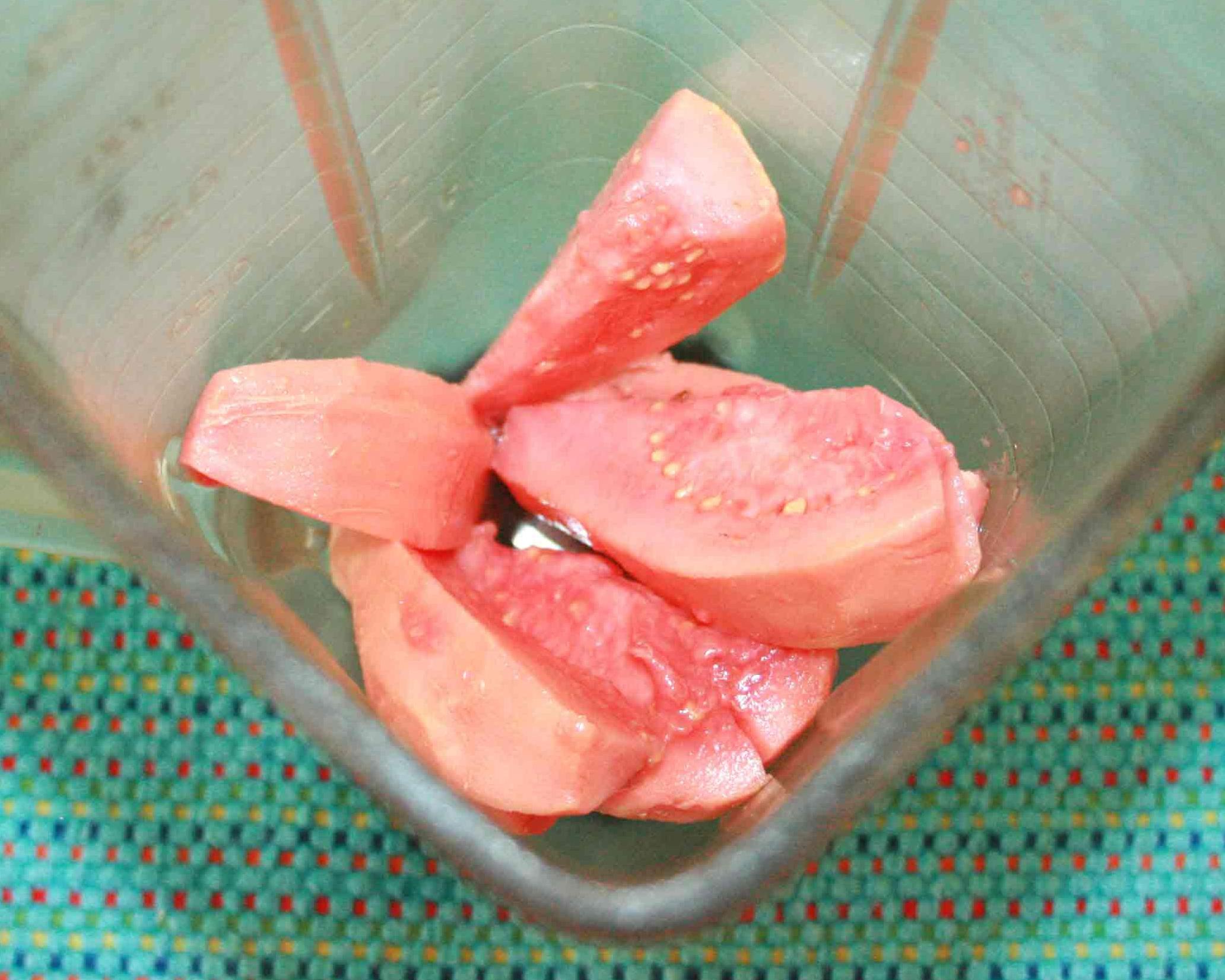 Descasque as goiabas e corte em pedaços. Bata no liquidificador com a água até obter um suco e passe por uma peneira, para filtrar as sementes.