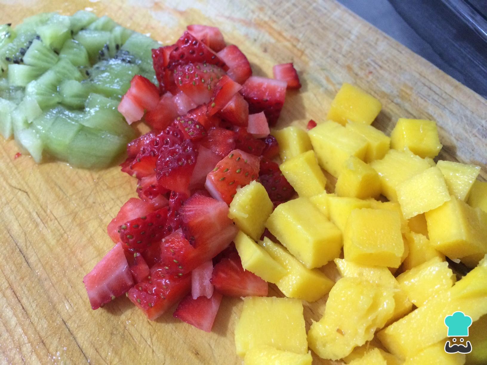 Em seguida prepare as frutas: descasque o kiwi e a manga e corte em cubos pequenos junto com os morangos.
