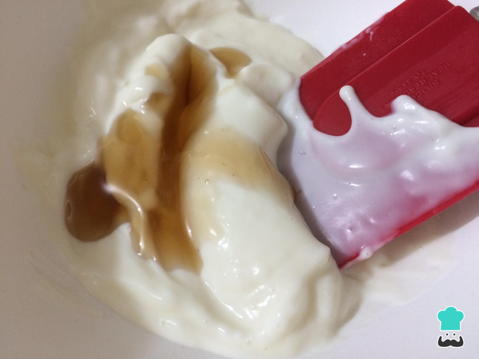 Para dar o toque cremoso a este sorvete com frutas, misture o iogurte com o mel até incorporar completamente.