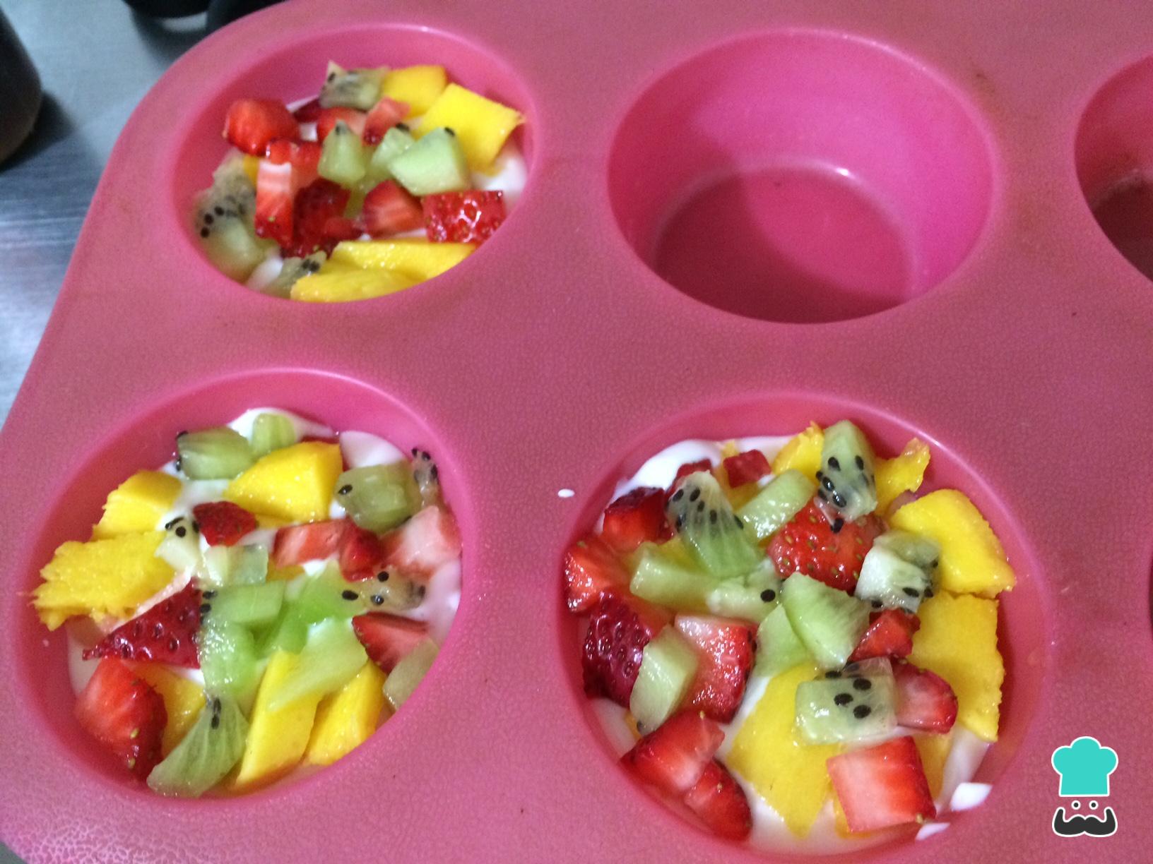 Distribua o iogurte por forminhas e cubra com as frutas misturadas. Reserve na no congelador por, no mínimo, 2 horas.
