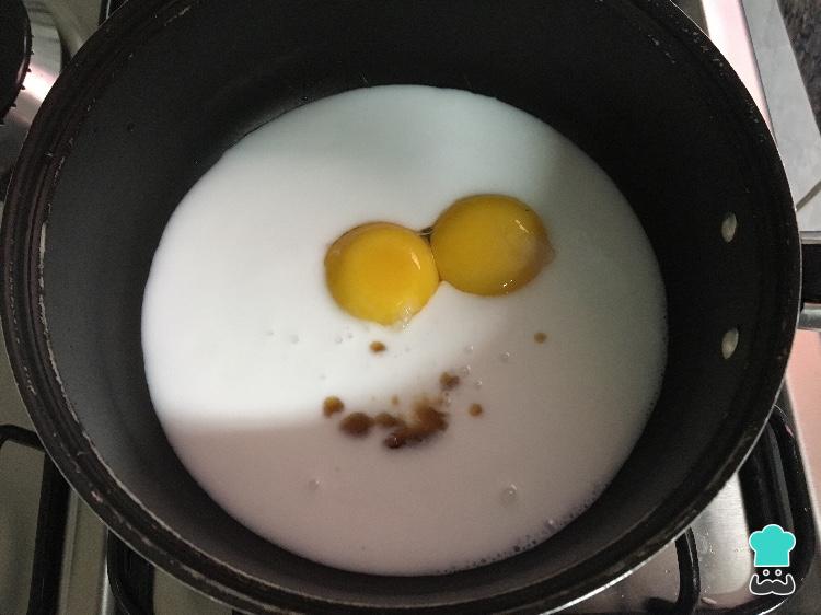 Para a base do sorvete de leite Ninho junte em uma panela o leite de coco, as gemas e a essência de baunilha.