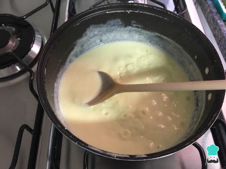 Em fogo baixo misture rapidamente sem parar, até começar a borbulhar. Nesse momento desligue o fogo e espere esfriar um pouco.