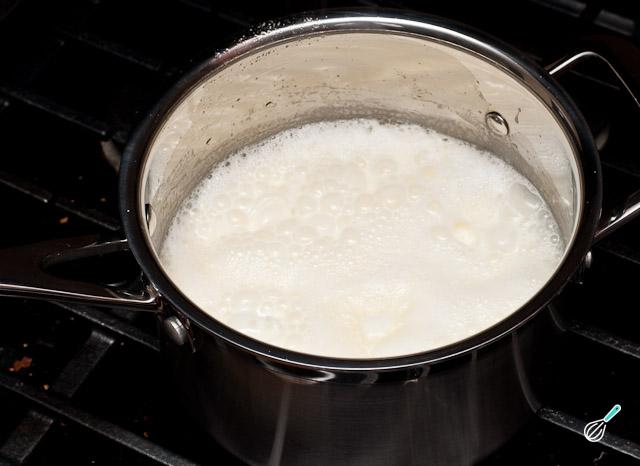 Para fazer o sorvete de marshmallow caseiro em uma panela aqueça o leite com o creme de leite. Quando ferver, adicione os marshmallows picados, abaixe o fogo e mexa até que os marshmallows se desfaçam totalmente.