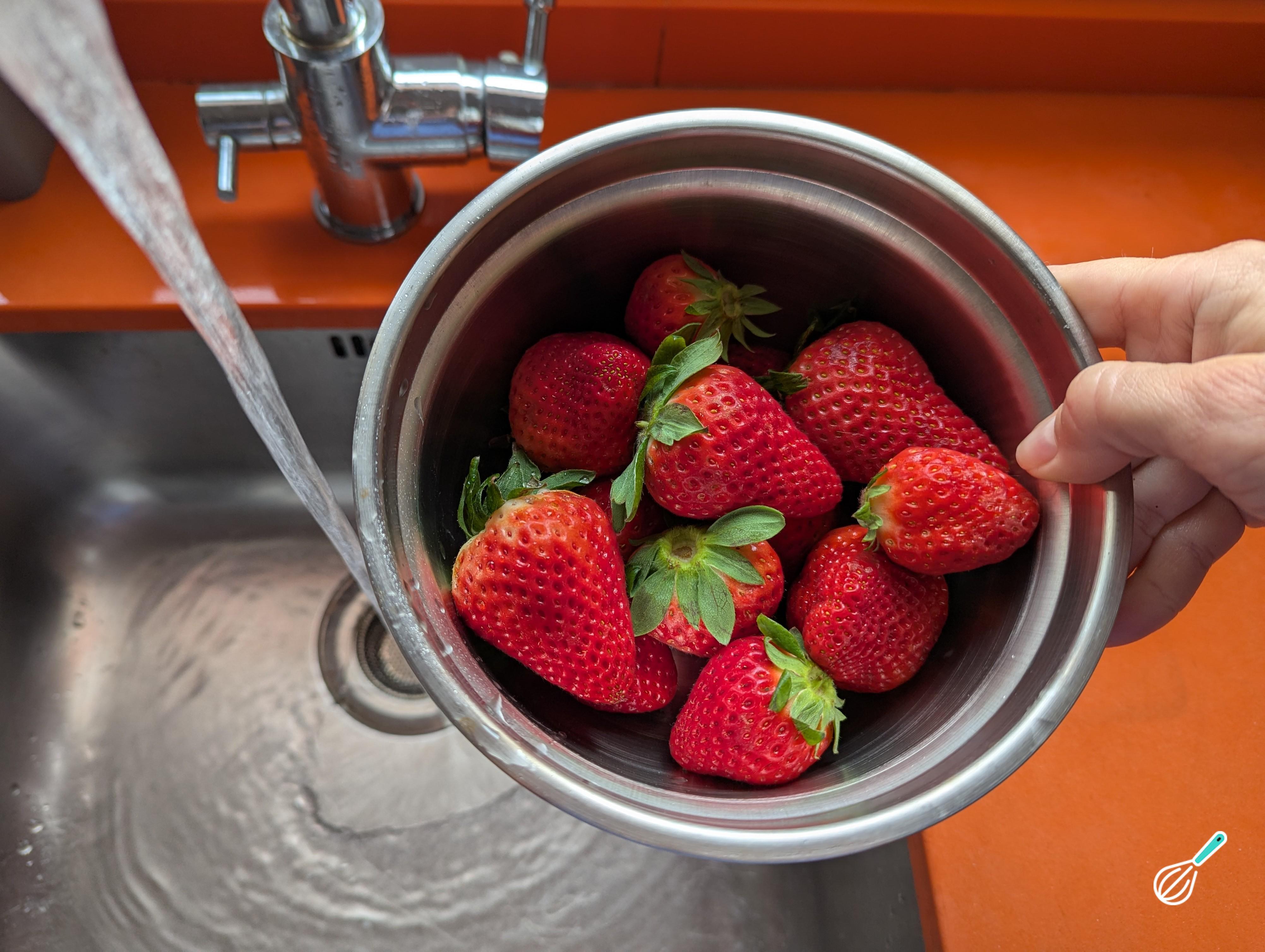 Antes de começar, você deve higienizar os seus morangos. Lave-os bem e retire as folhas e seque-os com papel toalha. Em seguida, coloque-os no congelador por pelo menos 4 horas, ou até que fiquem bem firmes. Se possível, congele-os de um dia para o outro para garantir um sorvete mais cremoso.