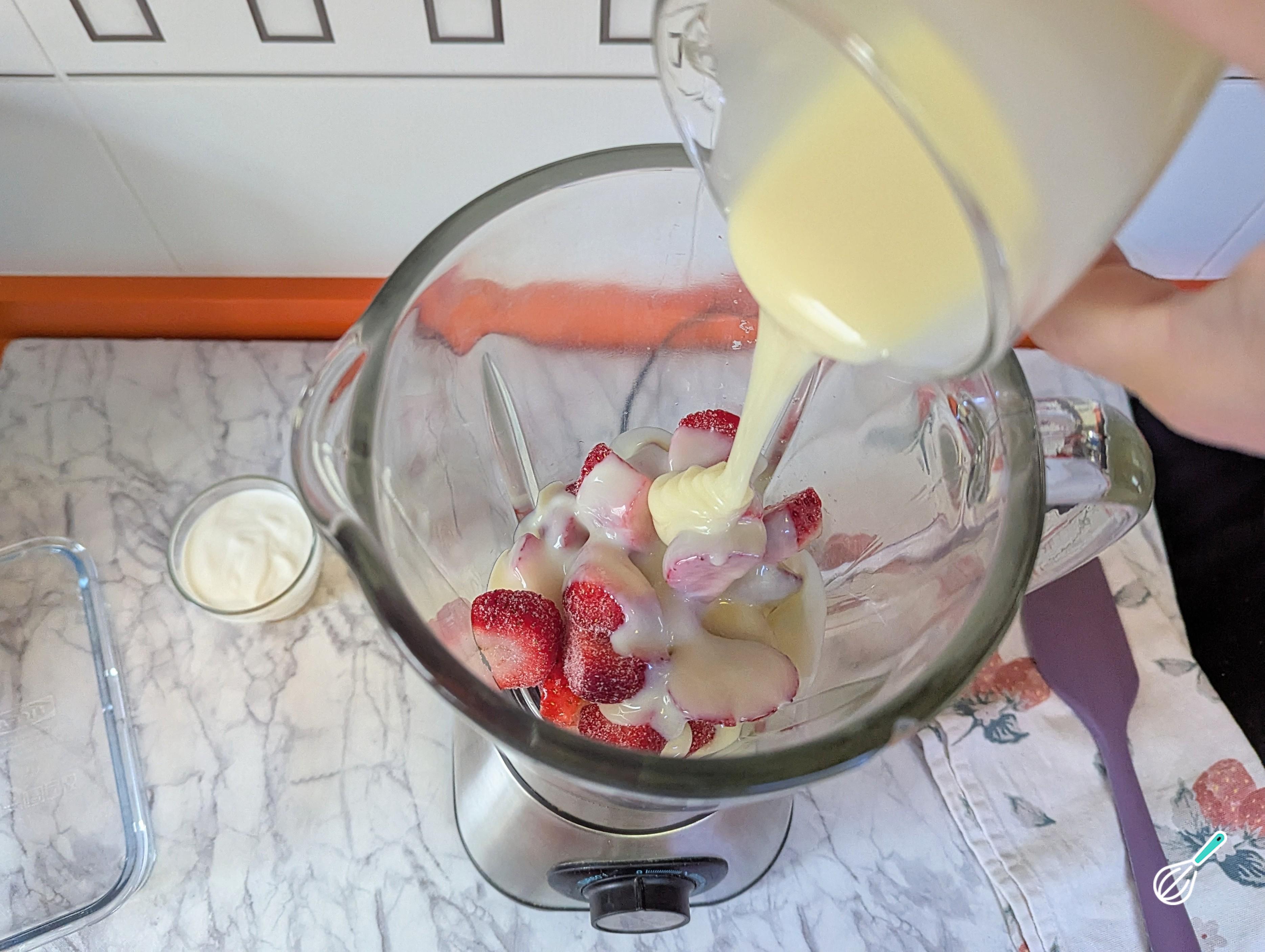 No liquidificador, adicione os morangos congelados, o leite condensado e o creme de leite. Bata tudo até obter uma mistura homogênea e cremosa.