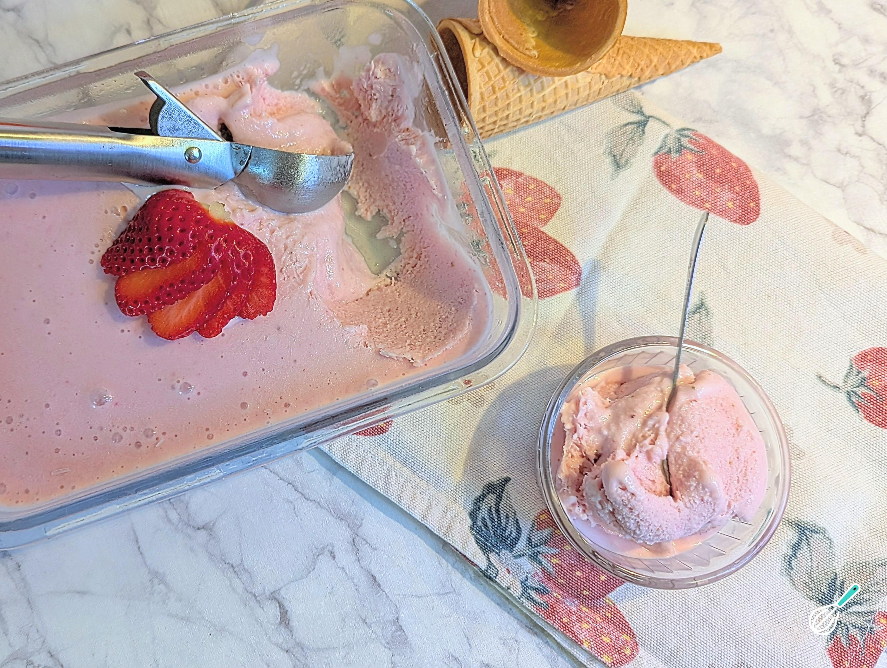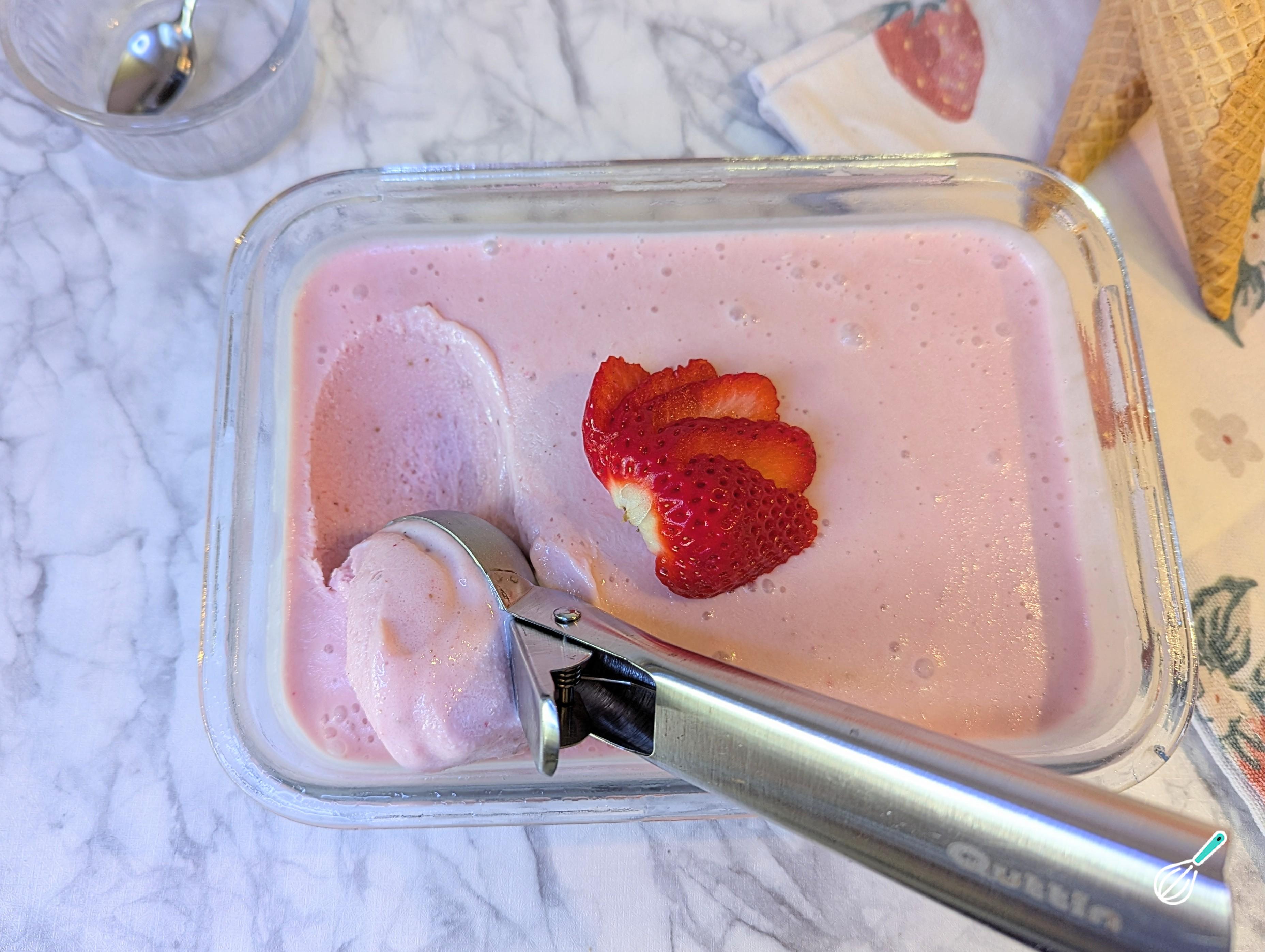 Prontinho! Agora você tem um sorvete de morango caseiro delicioso, cremoso e super fácil de fazer com apenas três ingredientes. Essa receita é uma ótima opção para quem quer uma sobremesa refrescante e sem complicações!