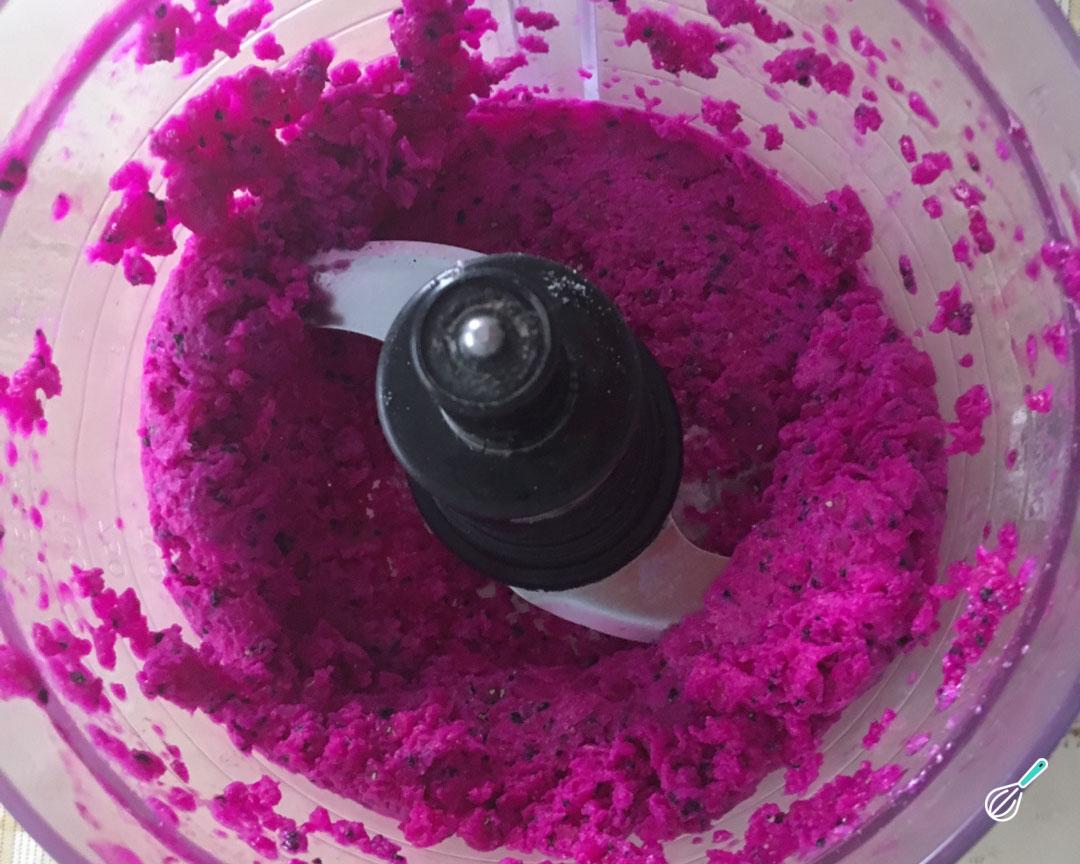 Em seguida coloque a pitaya no processador com os restantes ingredientes e bata até ficar cremoso igual a sorvete.