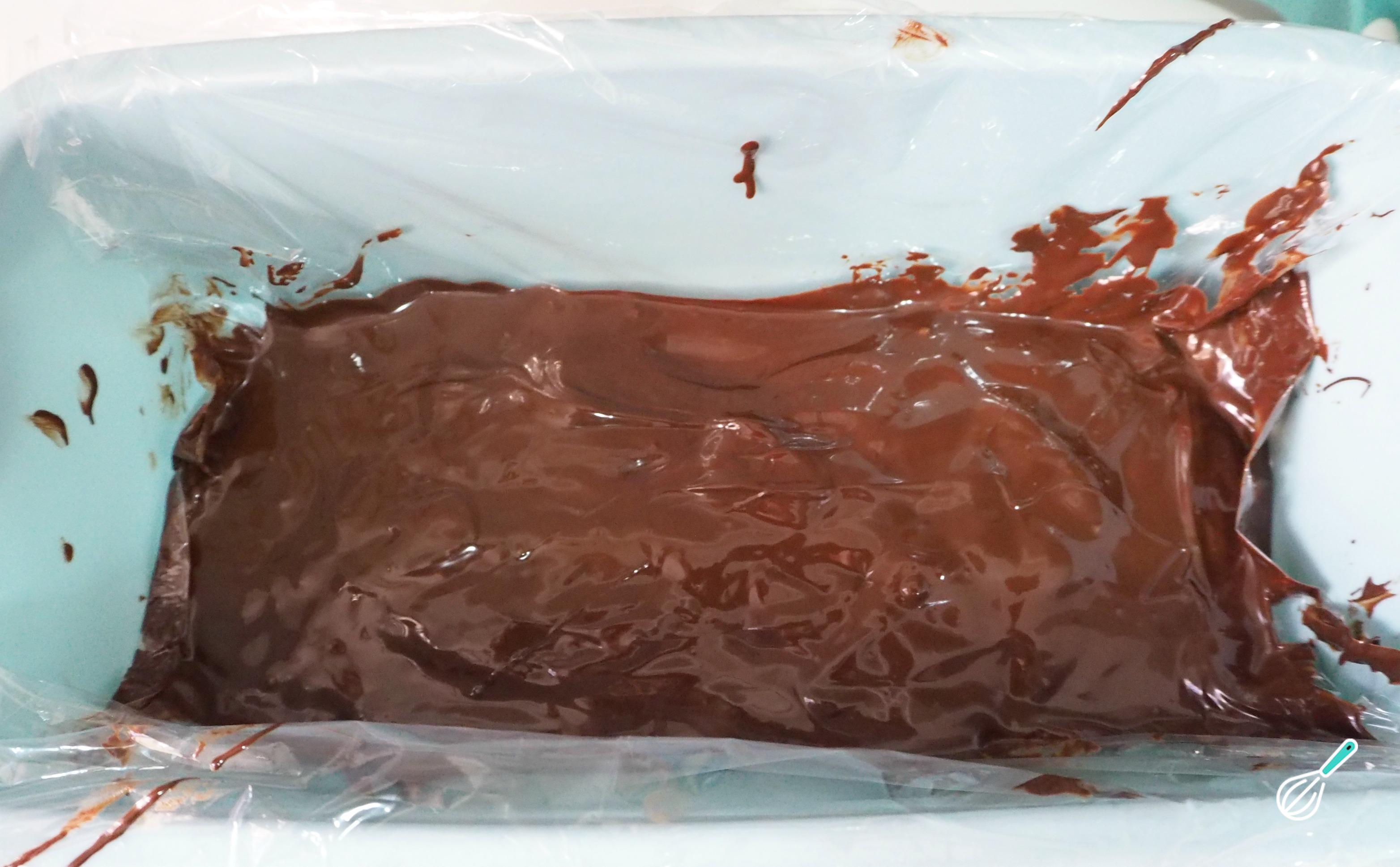 Após o passo anterior forre uma forma de pão com plástico filme (para ser fácil desenformar depois) e espalhe no fundo uma camada fina de chocolate (mas não transparente). Reserve no freezer.