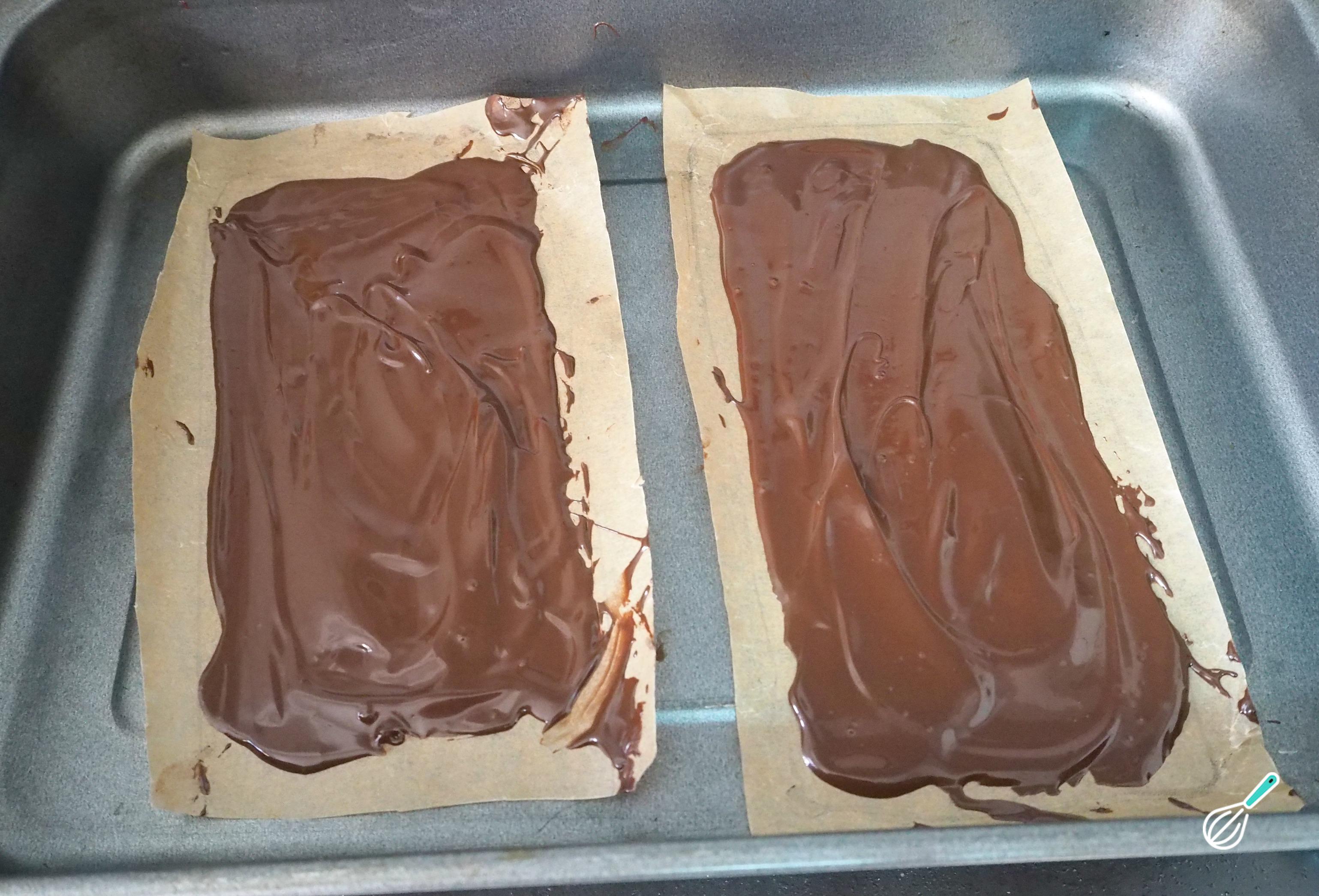 Espalhe o restante chocolate em pedaços de papel manteiga, tentando que sejam do mesmo tamanho que o que colocou na forma de pão. Estas serão as placas de chocolate do sorvete. Reserve no freezer também.