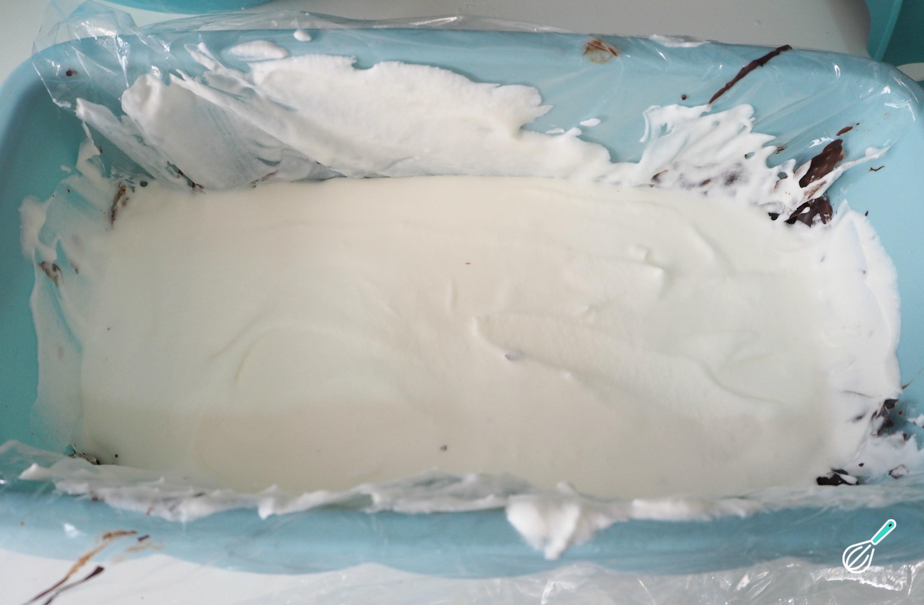 Termine o sorvete com uma placa de chocolate e reserve na geladeira por, pelo menos, 6 horas, para gelar na perfeição. Quando for para servir, retire o sorvete da geladeira cerca de 1 hora antes, caso contrário estará demasiado duro para comer.