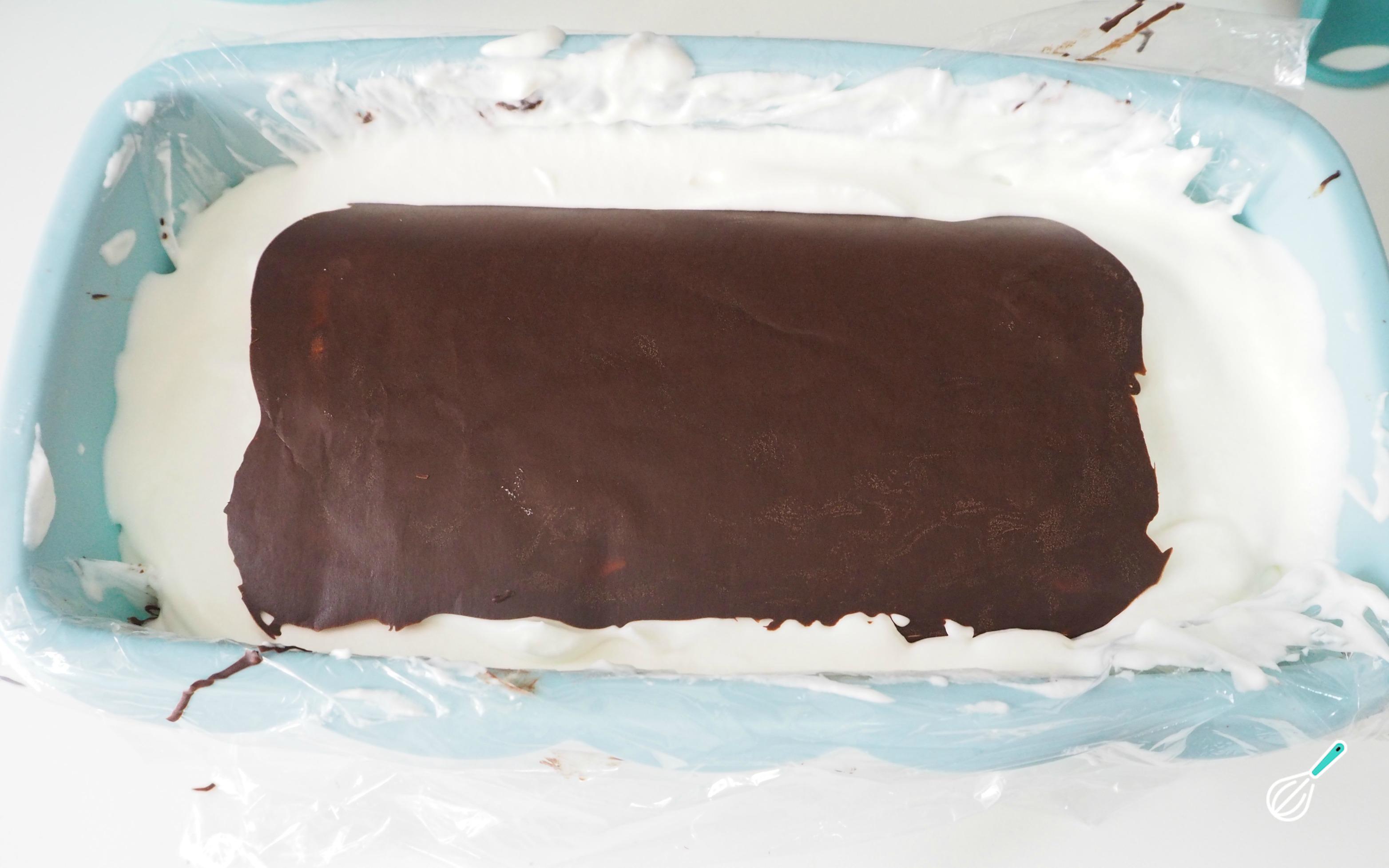 Para montar o sorvete Viennetta retire a forma de pão do freezer e espalhe sobre o chocolate um pouco do creme de sorvete de baunilha. Cubra com uma das placas de chocolate, adicione mais um pouco de sorvete, cubra com outra placa de chocolate e assim sucessivamente até terminar os ingredientes.
