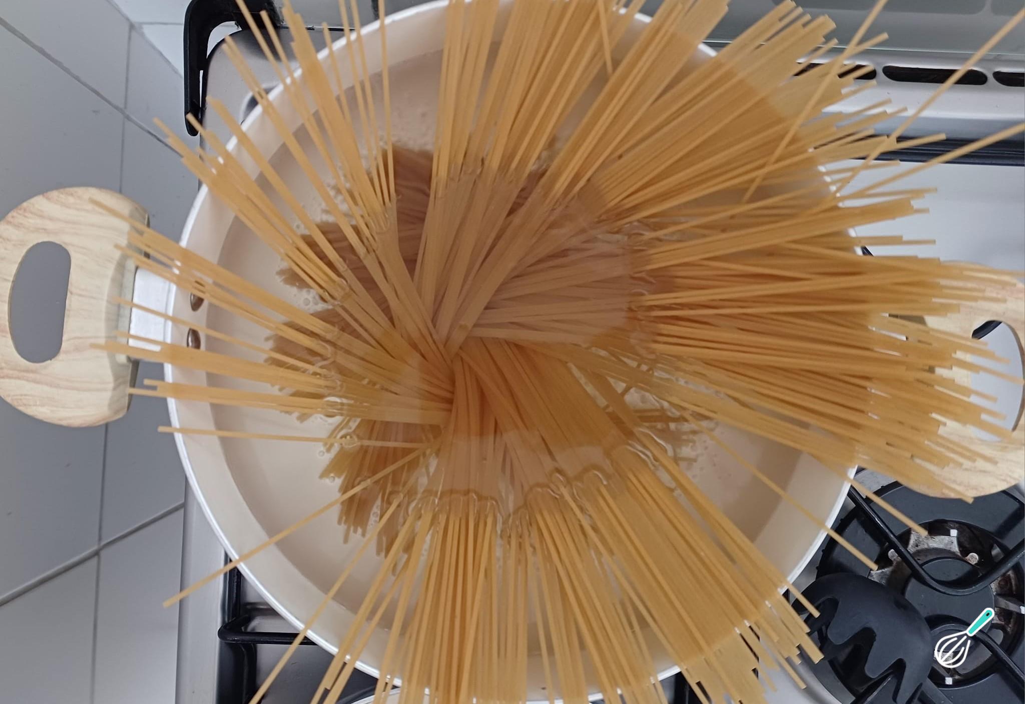 Com a água fervendo, acomode o espaguete distribuindo-o para que fique totalmente coberto pela água. Deixe cozinhar pelo tempo mínimo sugerido na instrução da embalagem, de preferência retirando-o da cocção quando estiver al dente.