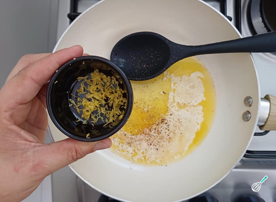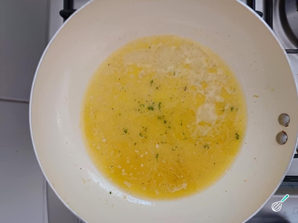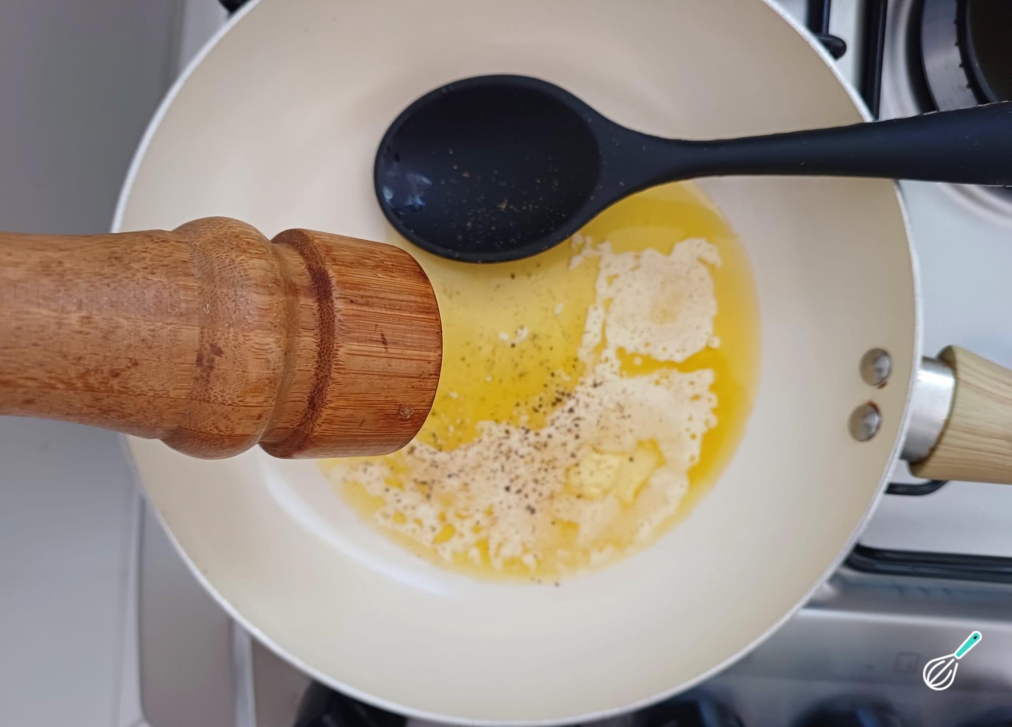 Enquanto a massa cozinha, comece preparando o molho. Numa frigideira média, derreta a manteiga e tempere-a com sal e pimenta-do-reino.
