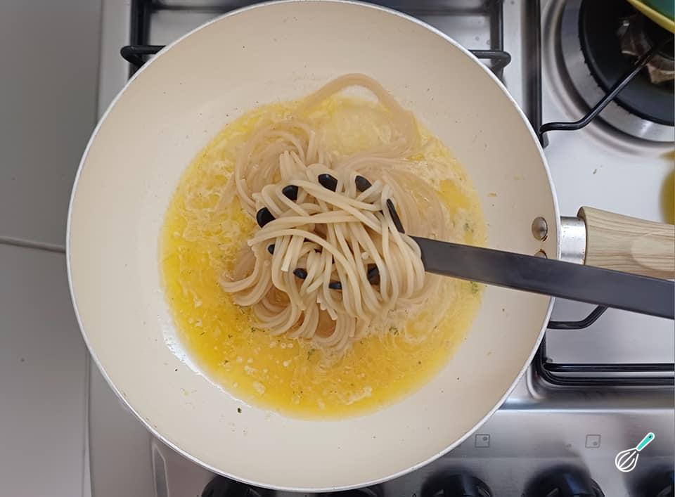 Quando o macarrão estiver cozido al dente, retire-o para adicioná-lo à frigideira com o molho. Transfira a massa cozida para o molho.