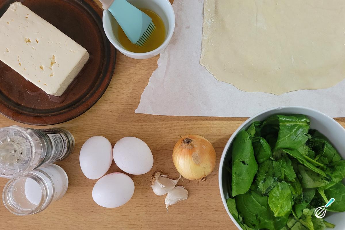 Separe os ingredientes para fazer sua spanakopita. Aqui usei uma massa filo caseira, mas a massa filo pode ser encontrada pronta no mercado, por vezes congelada. A massa filo é delicada, então se for usar a massa filo congelada, deixe descongelar totalmente antes de usar na geladeira, nunca em temperatura ambiente para que não fique quebradiça.