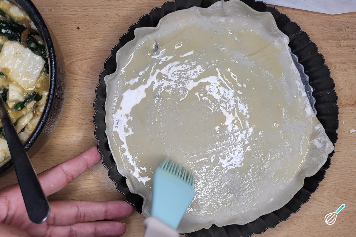 Pincele com azeite (ou manteiga derretida) e coloque mais uma folha de massa. Repita o processo colocando 4 a 5 folhas de massa filo para a base da torta, sempre pincelando azeite ou manteiga entre as folhas.