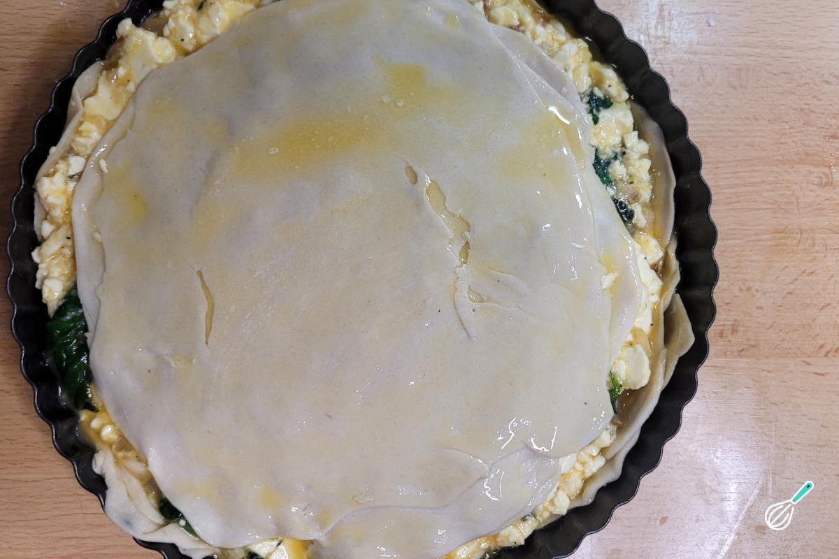 Coloque mais 4-5 folhas de massa filo sobre o recheio, sempre intercalando com o azeite ou manteiga derretida. Pincele mais azeite ou manteiga sobre a última camada.