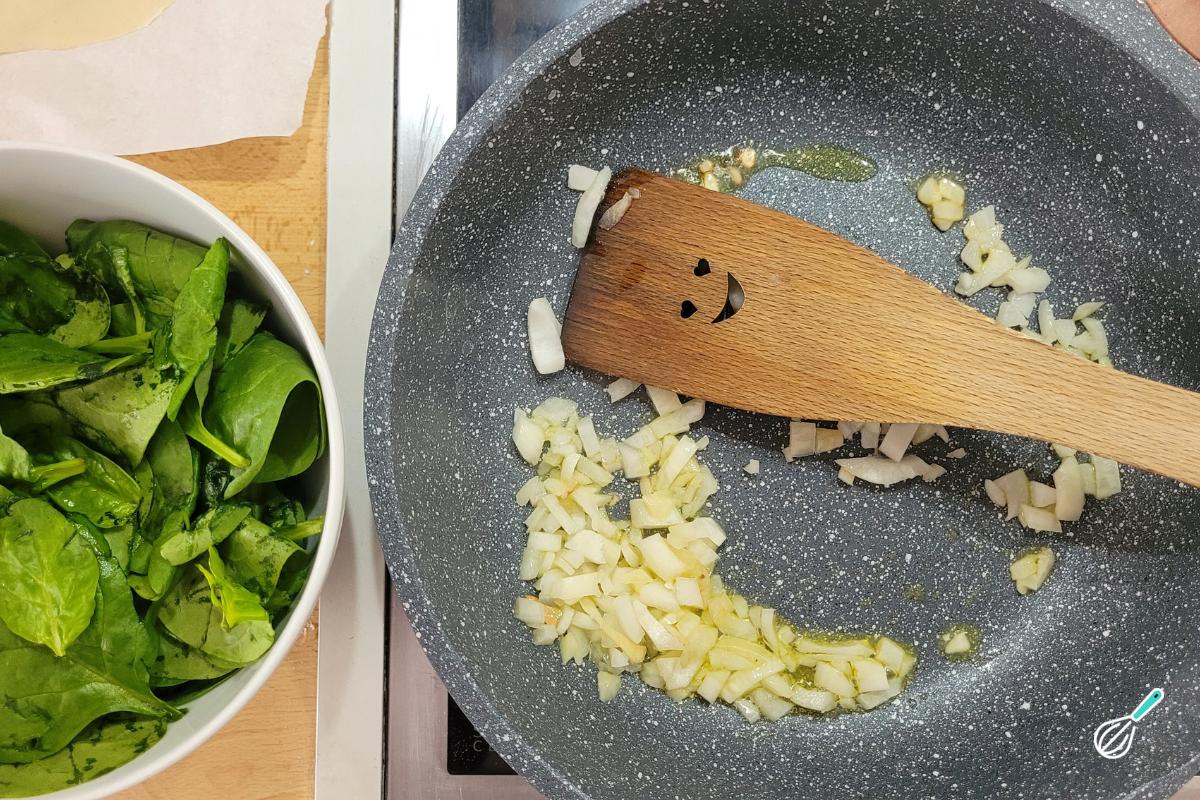 Comece pelo recheio para deixar esfriar antes de colocar sobre a massa. Em uma frigideira com azeite, leve a cebola para refogar.