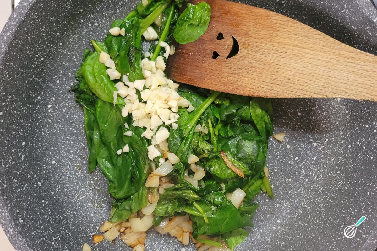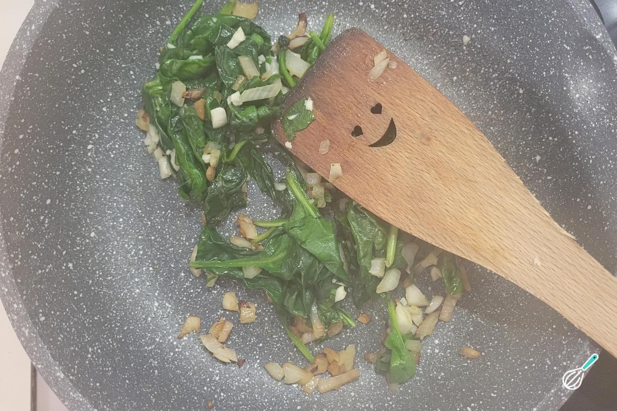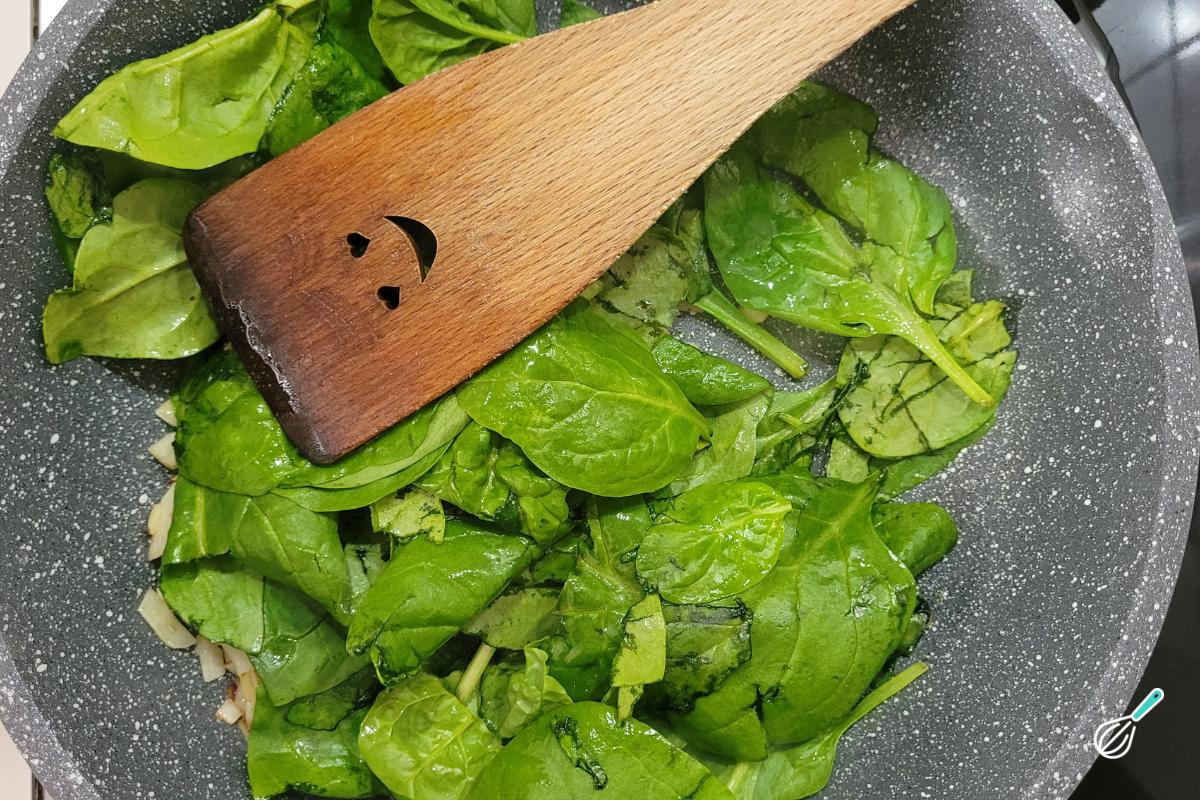 Quando estiver dourada, junte o espinafre e deixe murchar um pouco. Tempere com sal e pimenta do reino.