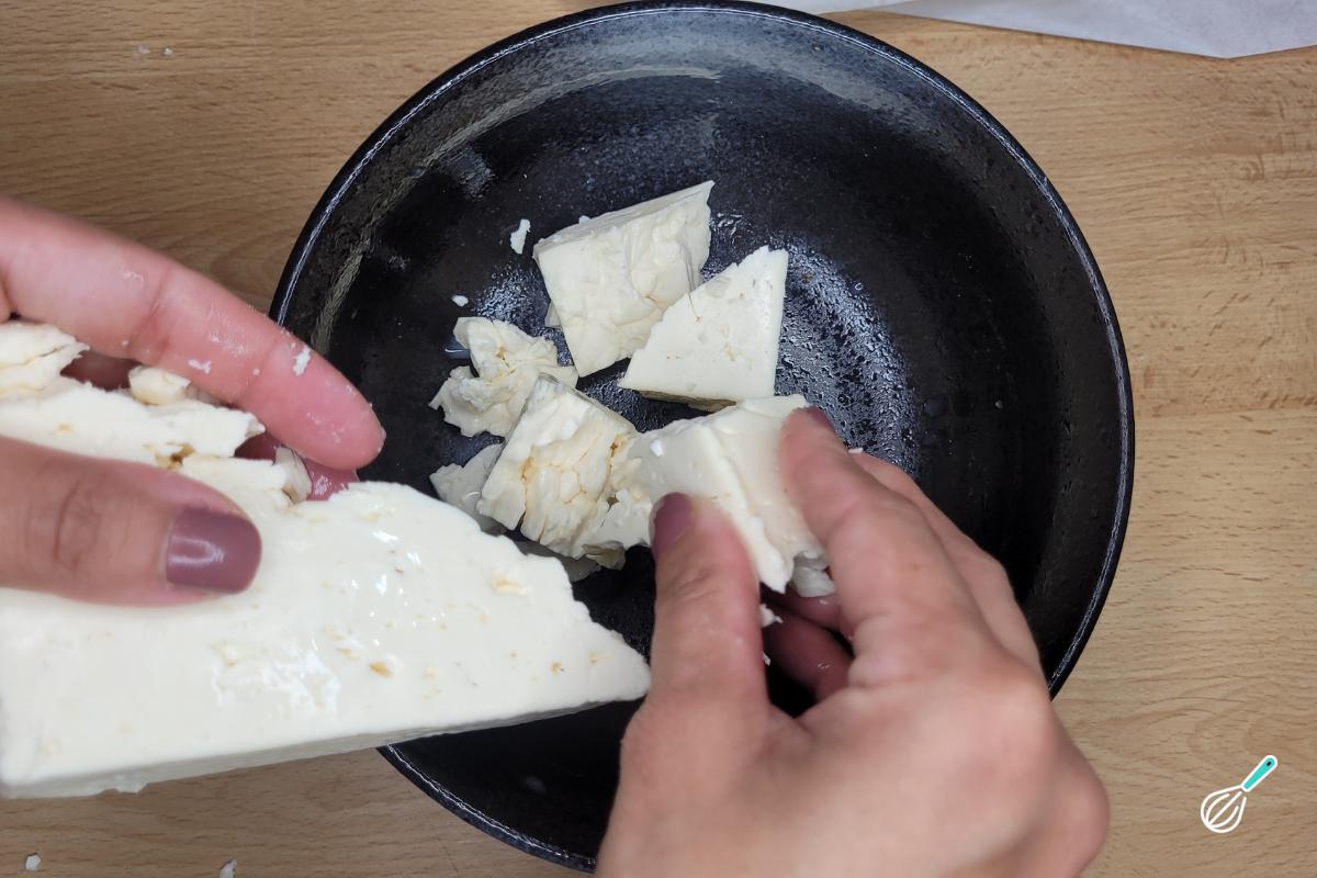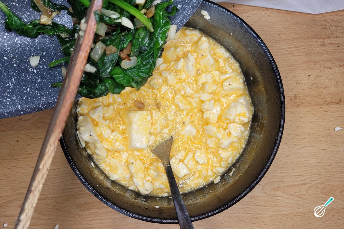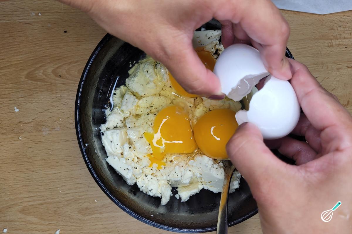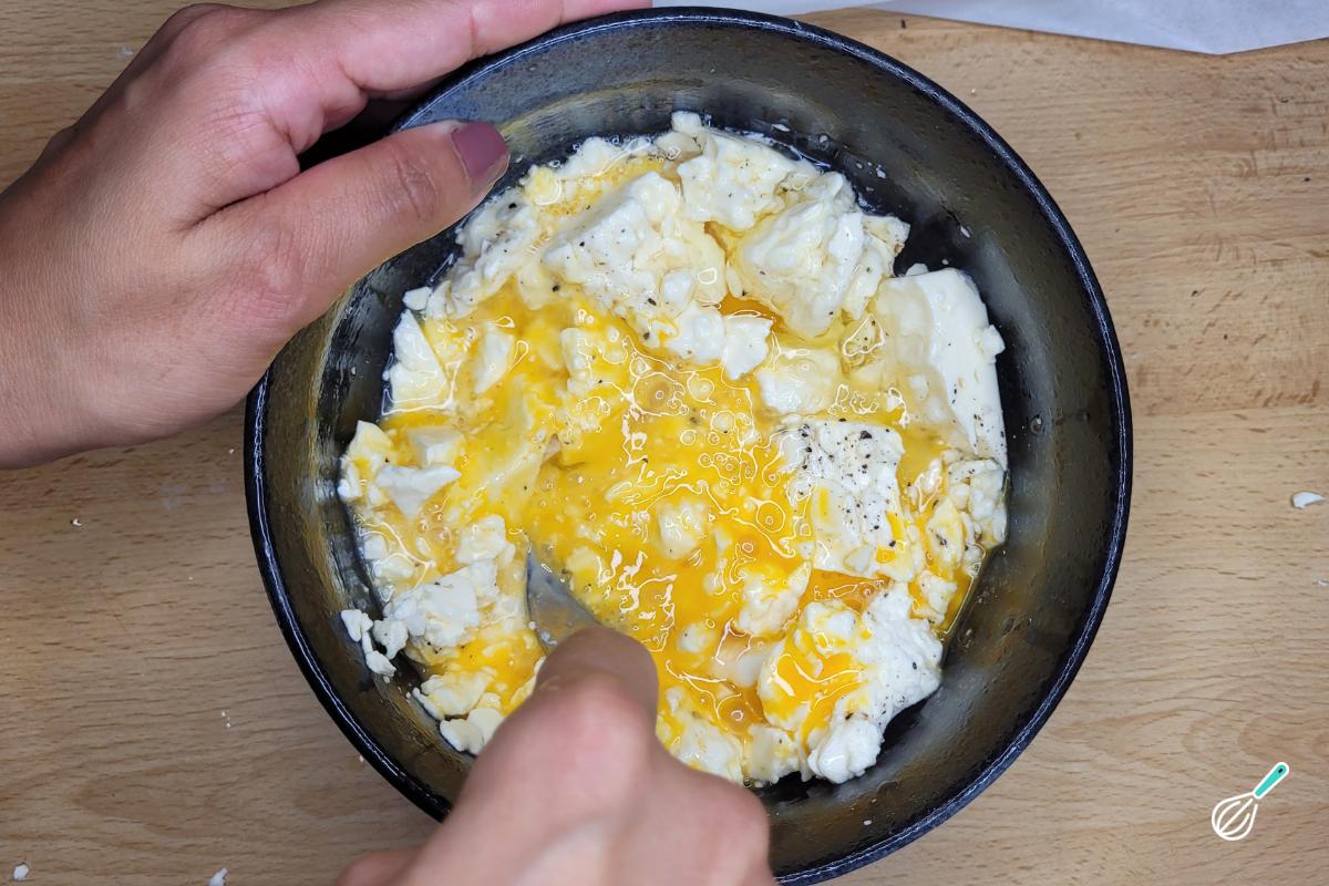 Tempere com pimenta do reino e misture bem. Aqui não coloquei sal, pois o queijo feta já é bem salgado. Se for usar ricota, sugiro colocar sal.