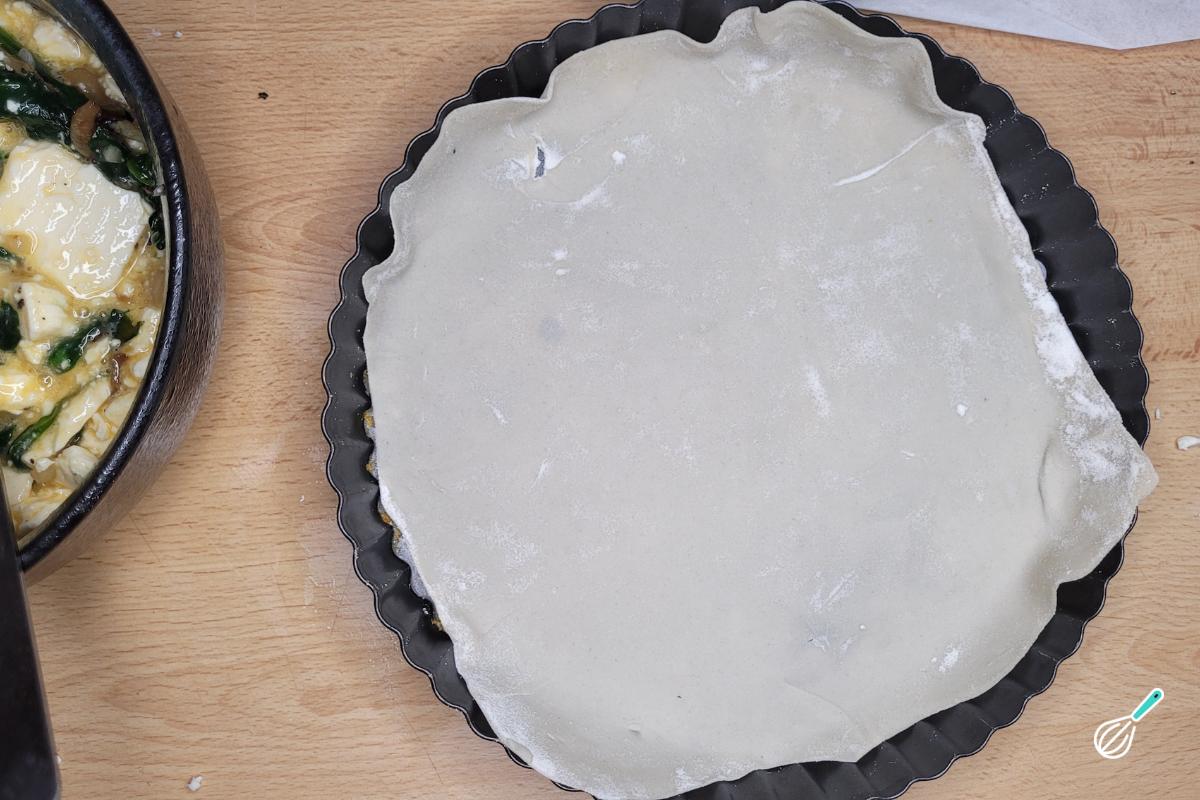 Para montar a massa, coloque uma folha de massa filo sobre a forma onde irá assar a torta. Trabalhe sempre com a massa filo com delicadeza, sem puxar muito.