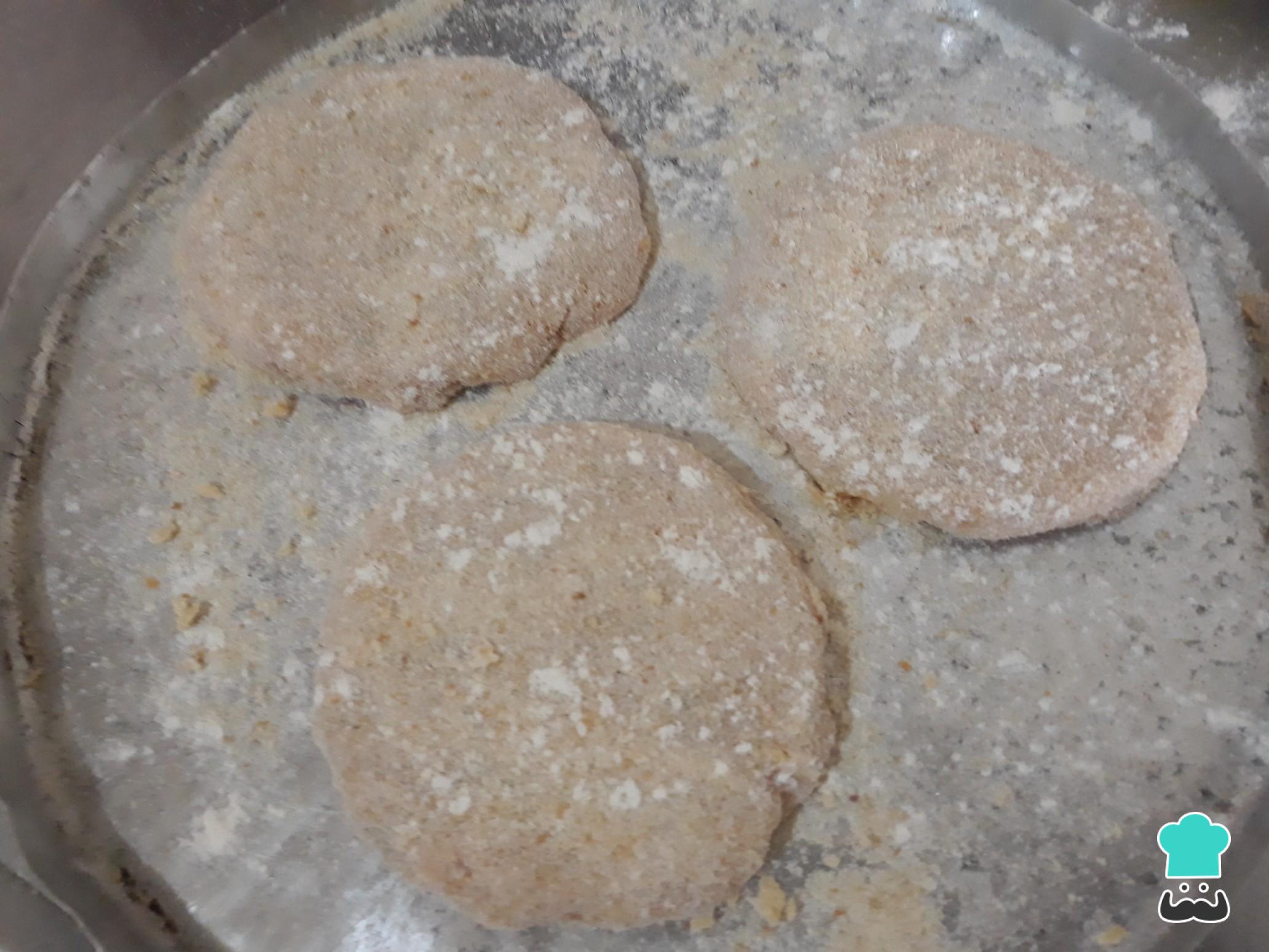 Disponha em pratos os ingredientes para empanar da seguinte forma: farinha de trigo, o ovo batido com o leite e a farinha de rosca. Passe os steaks, um a um, nos ingredientes obedecendo essa sequência dos pratos, pressionando ligeiramente com as farinhas para empanar melhor.