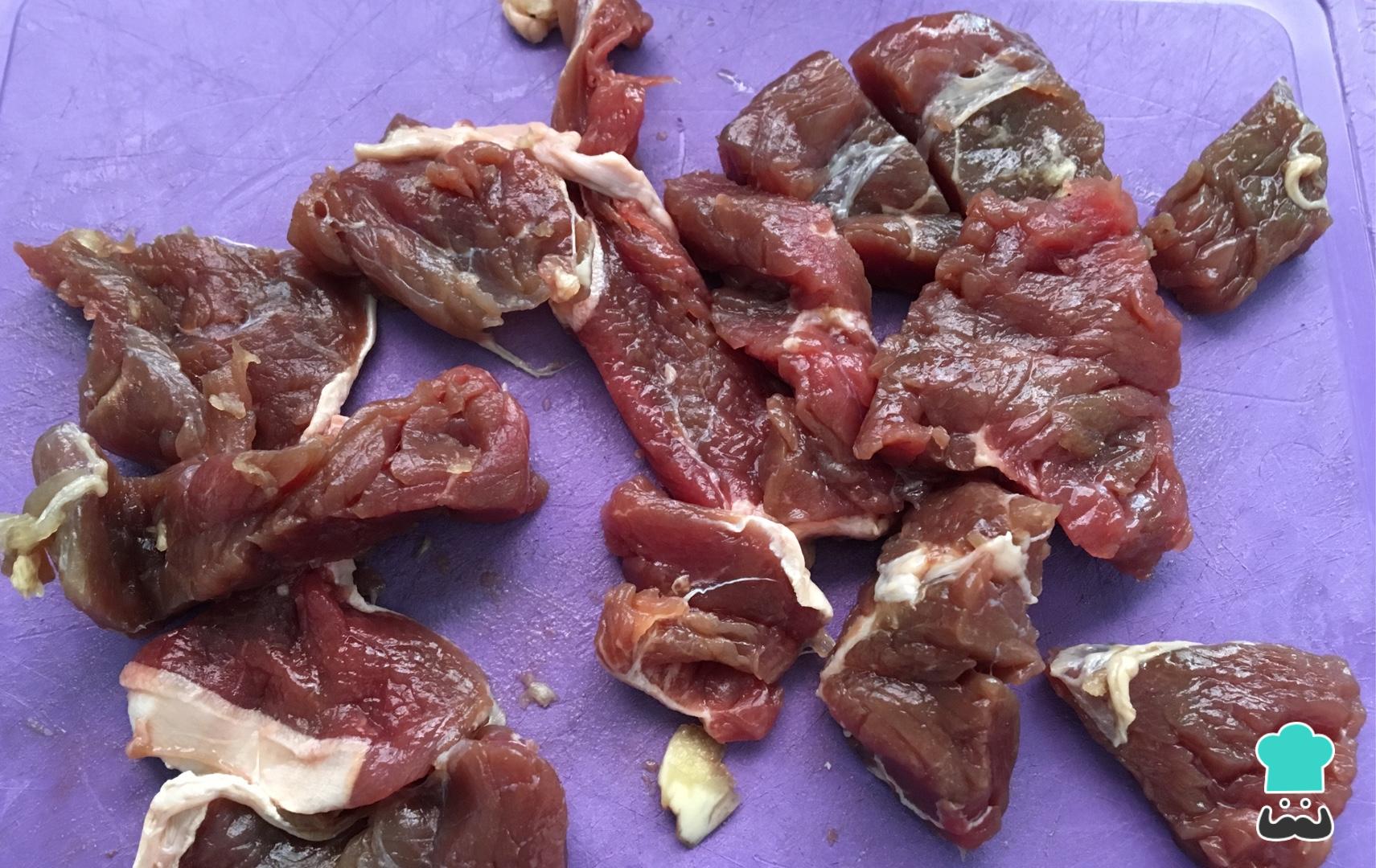 Em seguida corte a carne em cubinhos.