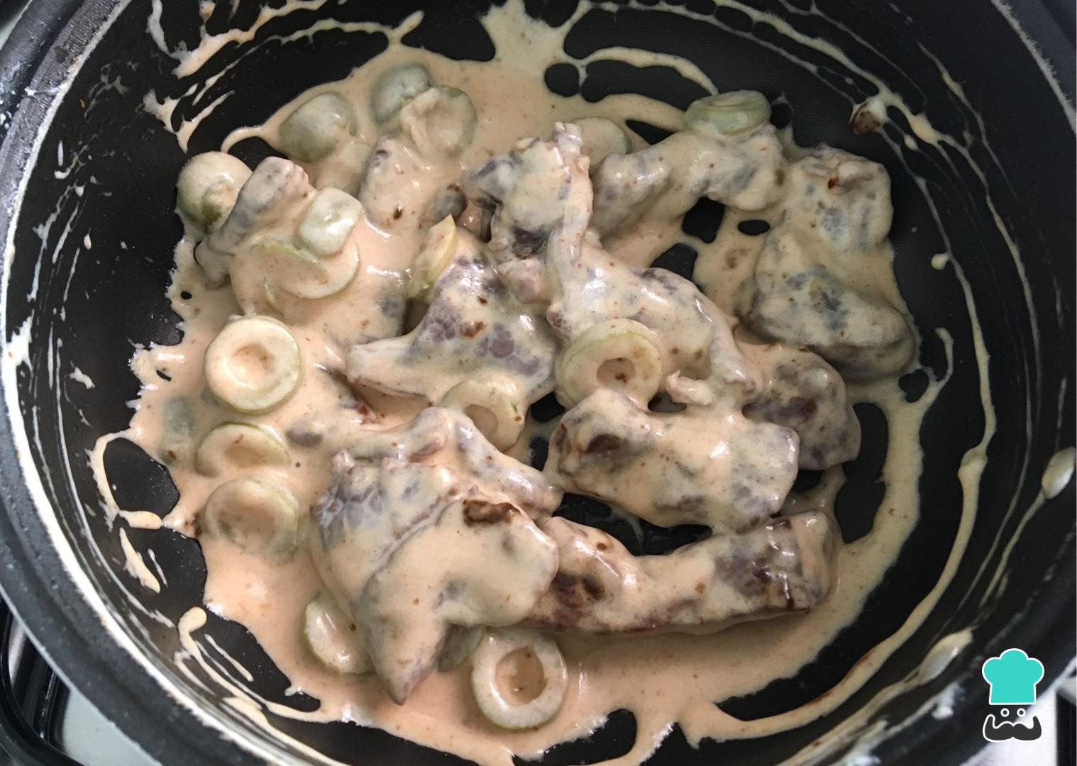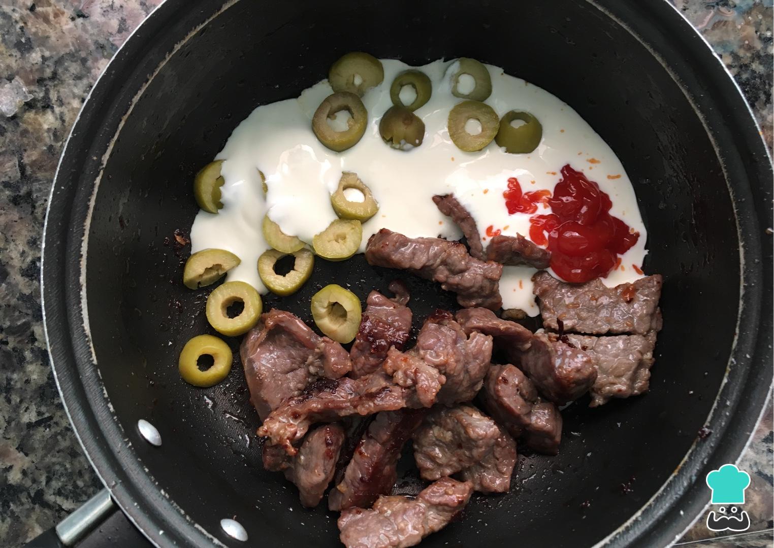 Assim que a carne começar a fritar e mudar de cor, junte o creme de leite, o catchup e as azeitonas.