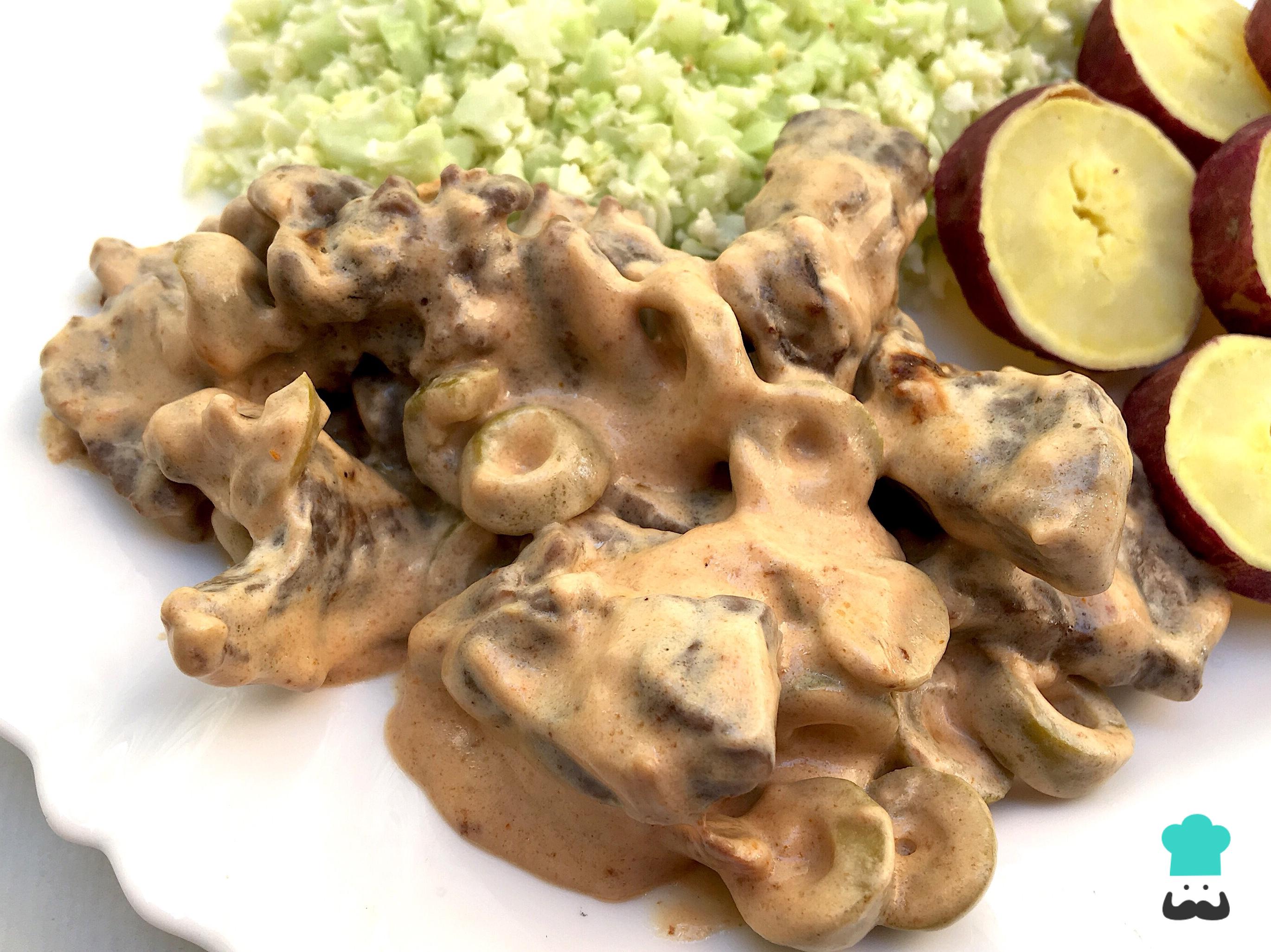 Sirva seu strogonoff de carne simples com catchup em seguida e diga nos comentários o que você achou! Eu acompanhei com arroz de couve-flor e batata doce cozida.