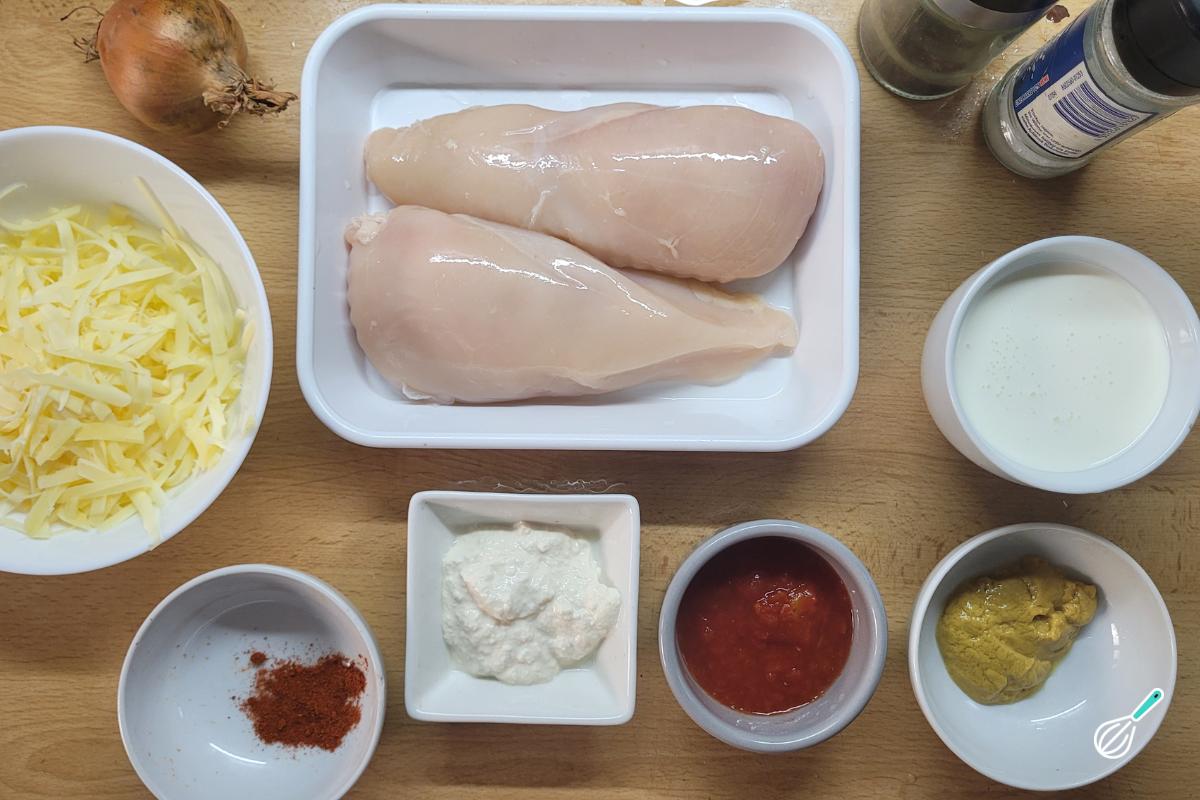 Separe os ingredientes para fazer seu strogonoff de frango com queijo. O ideal para esta receita é usar um queijo que derreta bem.
