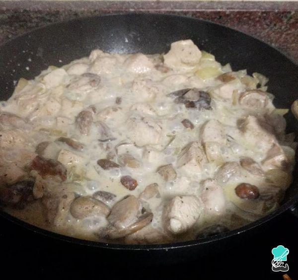 Adicione agora os cogumelos e o creme de leite e deixe cozinhar por cinco minutos em fogo baixo.