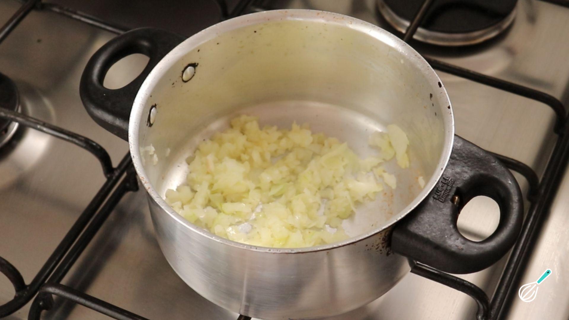 Leve uma panela ao fogo médio, despeje o azeite e refogue a cebola com uma pitada de sal.