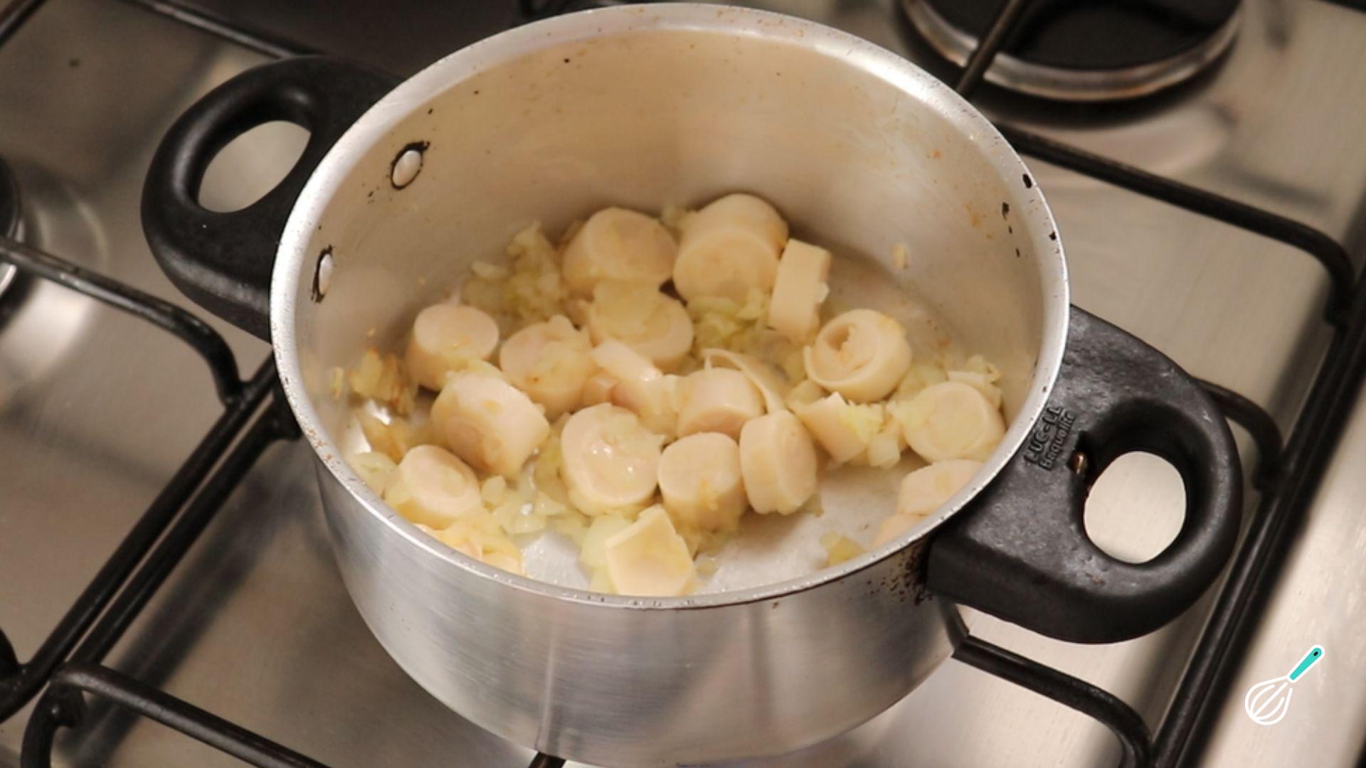 Junte o palmito cortado em rodelas não muito finas e refogue bem para ele pegar o sabor do refogado.