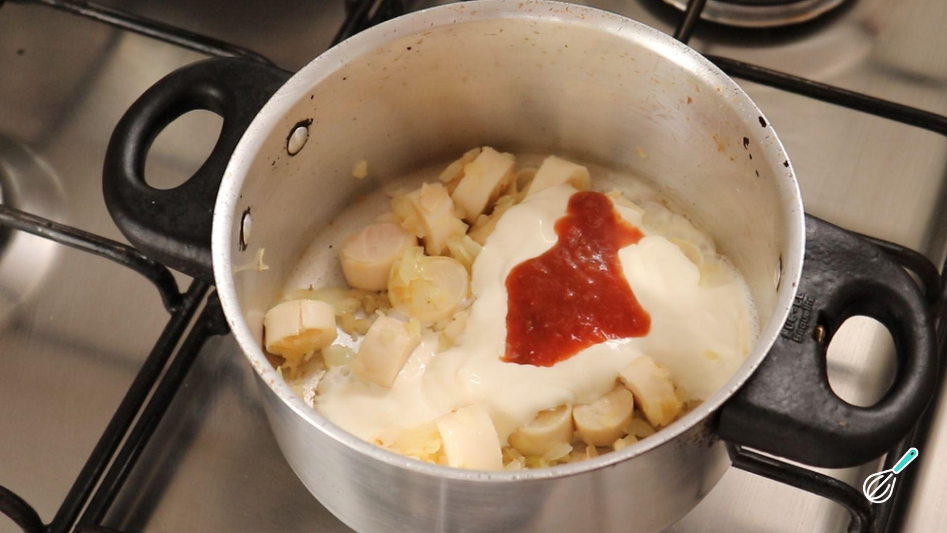 Assim que dourar despeje o creme de leite e o molho de tomate e misture bem. Acerte o sal se achar necessário.