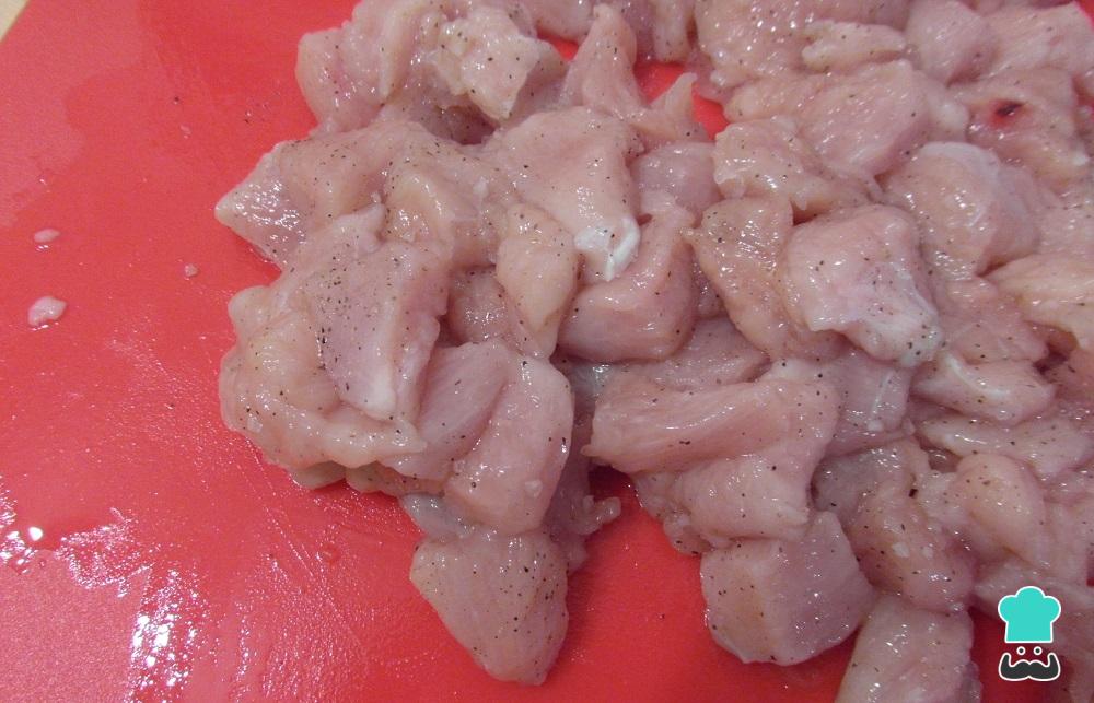 O primeiro passo para preparar este strogonoff de peru com leite de coco é cortar o peru em cubos e temperar com sal e pimenta.