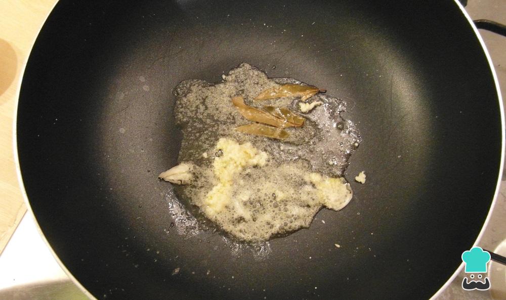 De seguida leve ao fogo médio uma frigideira com a manteiga, o alho esmagalhado e as folhas de louro. Deixe alourar e adicione a carne.