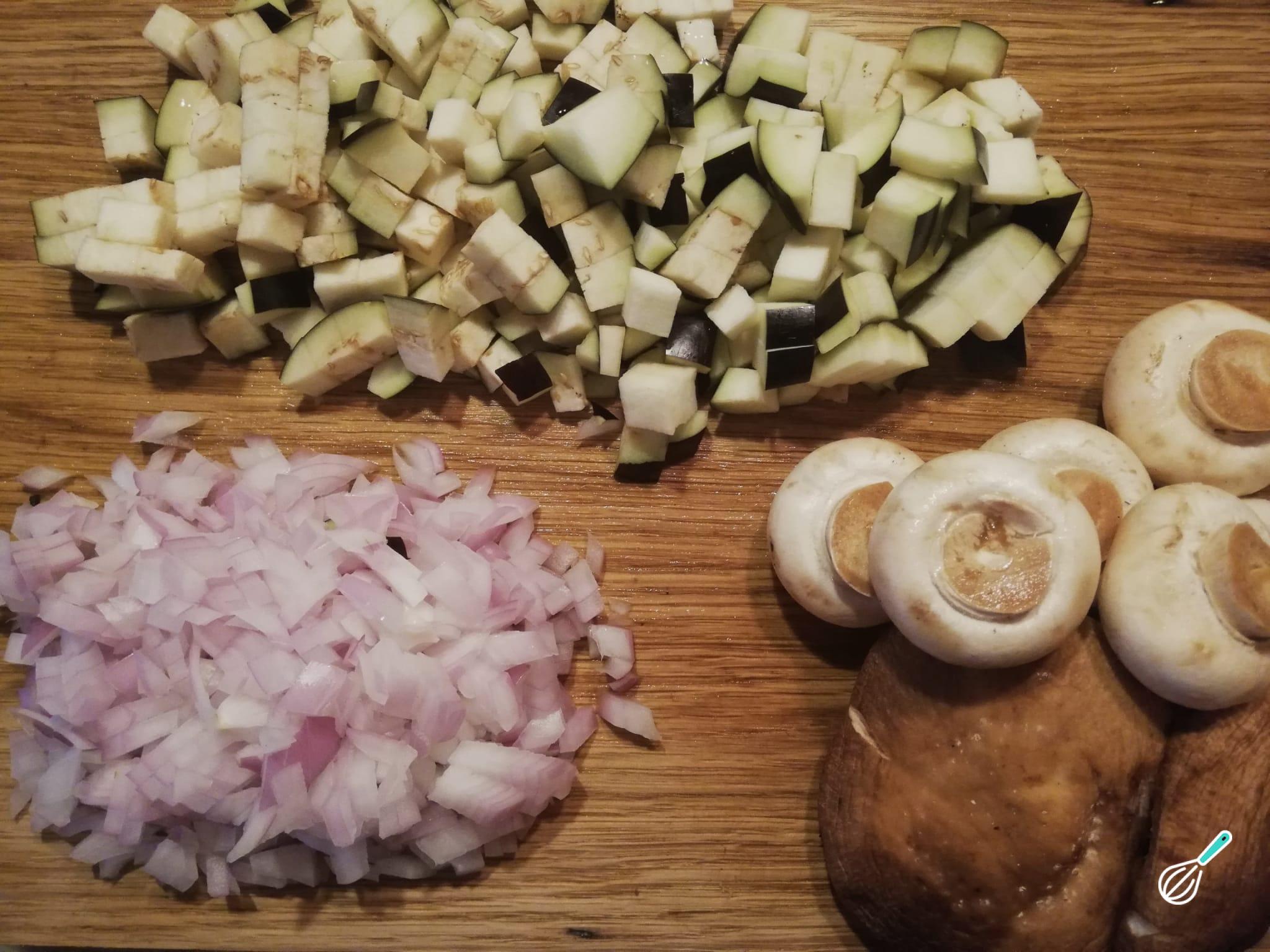 O primeiro passo é cortar os legumes. Neste caso piquei a cebola e a berinjela em cubinhos e os cogumelos em lâminas.