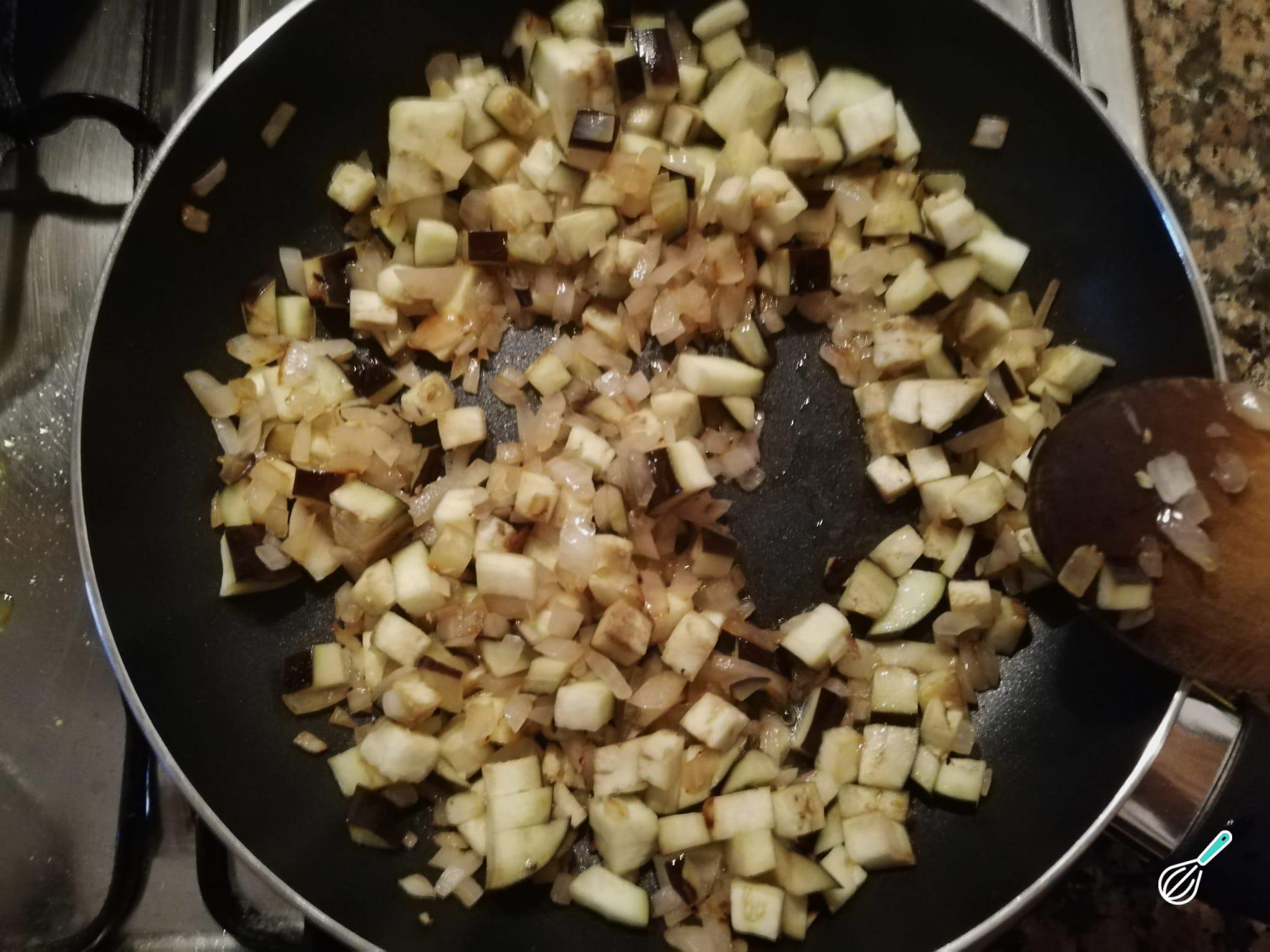 Depois refogue a cebola numa frigideira com um pouco de óleo. Quando a cebola estiver dourada, acrescente a berinjela picadinha.