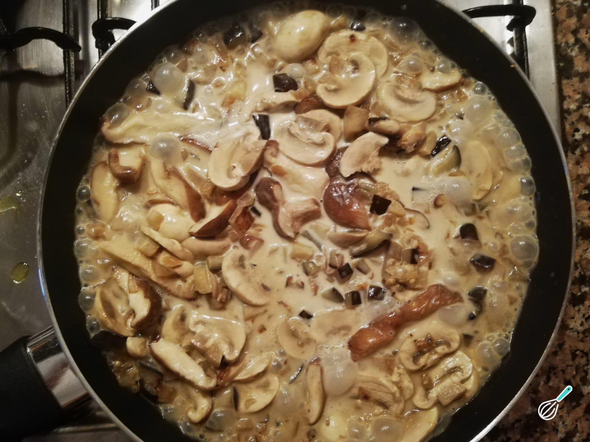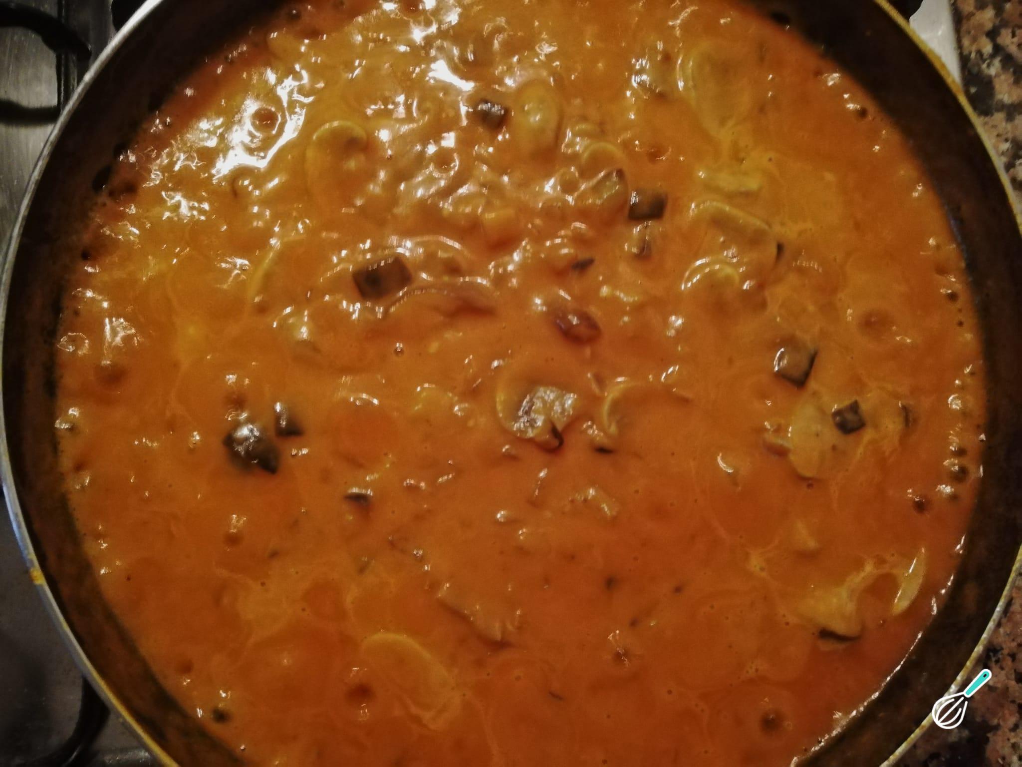 Em seguida acrescente os cogumelos e aguarde uns 5 minutos antes de adicionar o leite de coco. Nesse momento coloque também os temperos (curry e pimenta) e o sal. Deixe todos os ingredientes cozinhar em fogo baixo por, pelo menos, 10 minutos.