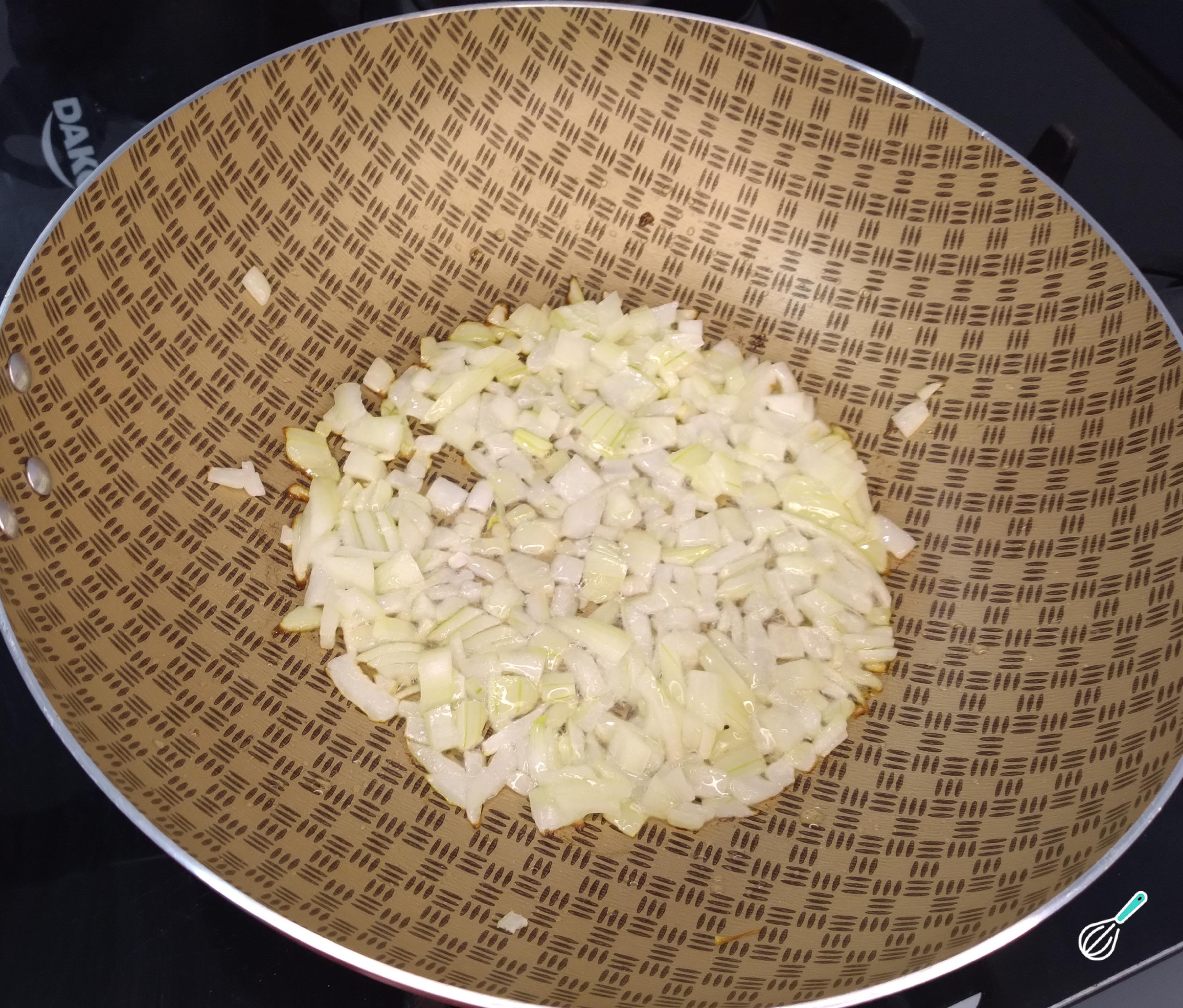 Depois disso, em uma panela aqueça o óleo e coloque a cebola para refogar. Deixe que ela solte líquidos e mexa sempre para evitar que queime.